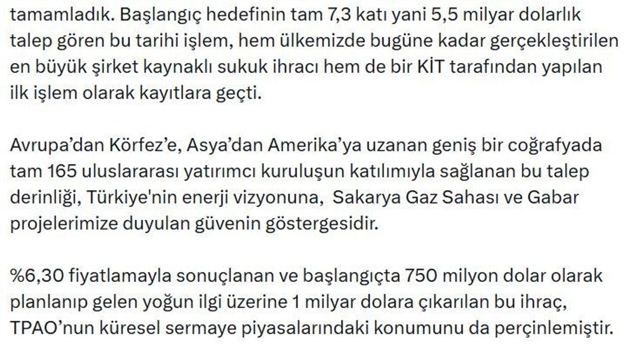 Bakan Bayraktar, sanal medya hesabından yaptığı açıklamada, 'TPAO'nun 1 milyar dolarlık 5 yıl vadeli sukuk ihracını başarıyla tamamladık. Başlangıç hedefinin tam 7,3 katı yani 5,5 milyar dolarlık talep gören bu tarihi işlem, hem ülkemizde bugüne kadar gerçekleştirilen en büyük şirket kaynaklı sukuk ihracı hem de bir KİT tarafından yapılan ilk işlem olarak kayıtlara geçti. Avrupa'dan Körfez'e, Asya'dan Amerika'ya uzanan geniş bir coğrafyada tam 165 uluslararası yatırımcı kuruluşun katılımıyla sağlanan bu talep derinliği, Türkiye'nin enerji vizyonuna, Sakarya Gaz Sahası ve Gabar projelerimize duyulan güvenin göstergesidir. Yüzde 6,30 fiyatlamayla sonuçlanan ve başlangıçta 750 milyon dolar olarak planlanıp gelen yoğun ilgi üzerine 1 milyar dolara çıkarılan bu ihraç, TPAO'nun küresel sermaye piyasalarındaki konumunu da perçinlemiştir. Milli enerji hamlemiz kapsamında yürüttüğümüz dev projelerimize alternatif finansman kaynakları oluşturarak ülkemizin değerine değer katmaya devam edeceğiz' dedi. (DHA)