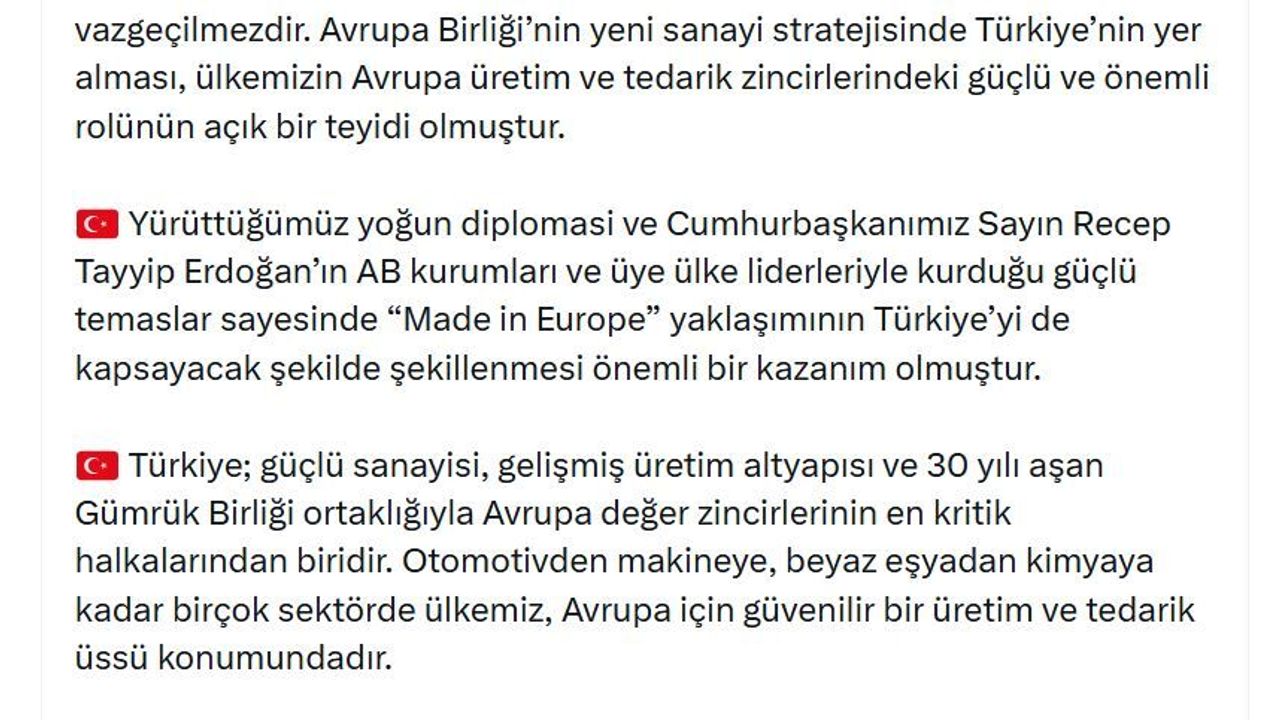 Bakan Bolat, sanal medya hesabından yaptığı açıklamada, 'Türkiye'nin üretim gücü ve stratejik konumu Avrupa sanayisi için vazgeçilmezdir. Avrupa Birliği'nin yeni sanayi stratejisinde Türkiye'nin yer alması, ülkemizin Avrupa üretim ve tedarik zincirlerindeki güçlü ve kritik rolünün açık bir teyidi olmuştur. Yürüttüğümüz yoğun diplomasi ve Cumhurbaşkanımız Sayın Recep Tayyip Erdoğan'ın AB kurumları ve üye ülke liderleriyle kurduğu güçlü temaslar sayesinde 'Made in Europe' yaklaşımının Türkiye'yi de kapsayacak şekilde şekillenmesi önemli bir kazanım olmuştur. Türkiye; güçlü sanayisi, gelişmiş üretim altyapısı ve 30 yılı aşan Gümrük Birliği ortaklığıyla Avrupa değer zincirlerinin en kritik halkalarından biridir' dedi.