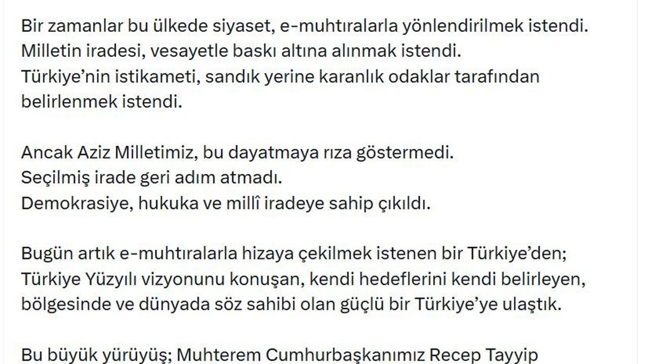 Bakan Çiftçi, sanal medya hesabından yaptığı açıklamada, '27 Nisan e-muhtırası, millet iradesini hizaya çekmeye çalışan vesayetçi aklın son karanlık teşebbüslerinden biri olarak hafızalarımızdadır. Bir zamanlar bu ülkede siyaset, e-muhtıralarla yönlendirilmek istendi. Milletin iradesi, vesayetle baskı altına alınmak istendi. Türkiye'nin istikameti, sandık yerine karanlık odaklar tarafından belirlenmek istendi. Ancak aziz milletimiz, bu dayatmaya rıza göstermedi. Seçilmiş irade geri adım atmadı. Demokrasiye, hukuka ve millî iradeye sahip çıkıldı' dedi.