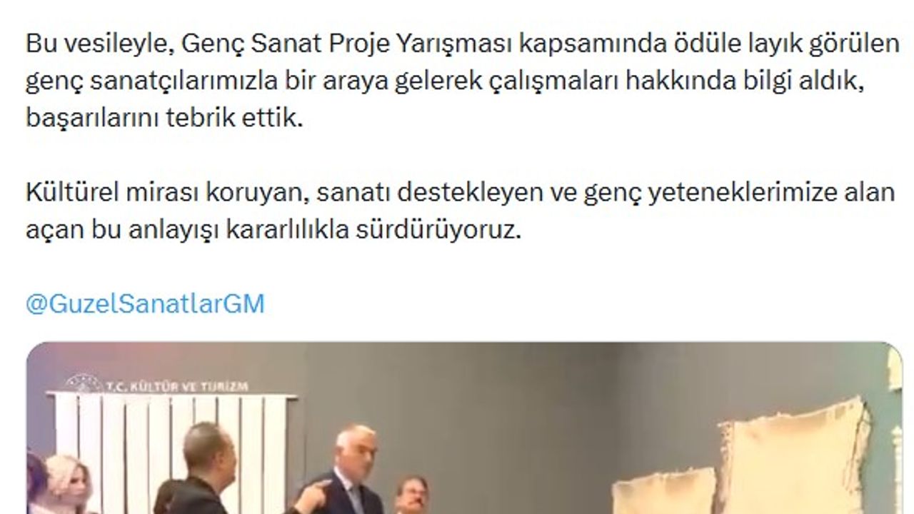 Bakan Mehmet Nuri Ersoy, sanal medya hesabından yaptığı paylaşımda, 'Ankara Resim ve Heykel Müzesi'nde 90 yıllık birikimi genç sanatçıların üretimleriyle bir araya getirdik. Güzel Sanatlar Genel Müdürlüğümüzün 90'ıncı yılına özel olarak hazırlanan, 'Bir İdealin İnşası ve İcrası' sergisi ile 'Genç Sanat: 11'inci Güncel Sanat Proje Yarışması Sergisi'ni ziyaret ettik. Bu vesileyle, Genç Sanat Proje Yarışması kapsamında ödüle layık görülen genç sanatçılarımızla bir araya gelerek çalışmaları hakkında bilgi aldık, başarılarını tebrik ettik. Kültürel mirası koruyan, sanatı destekleyen ve genç yeteneklerimize alan açan bu anlayışı kararlılıkla sürdürüyoruz' ifadelerini kullandı. (DHA)