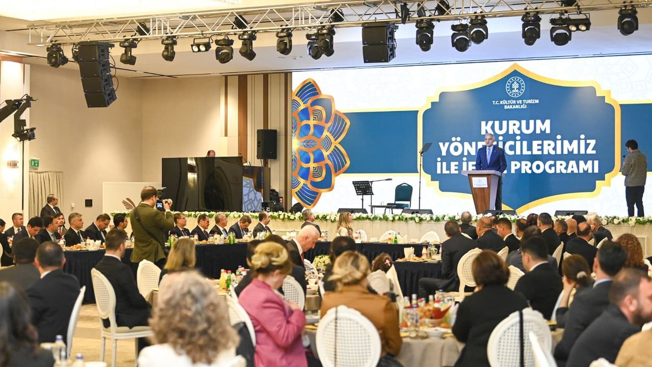 Bakan Ersoy sanal medya hesabından yaptığı paylaşımda, 'Ramazan ayının sonuna yaklaşırken bu mübarek ayın bereketini ve dayanışma ruhunu birlikte yaşadığımız kıymetli yöneticilerimizle iftar sofrasında buluştuk. Bu akşam aynı sofrayı paylaşırken büyük bir özveriyle yürüttüğümüz çalışmaların, güçlü ekip ruhumuzun ve ortak hedeflerimizin bizleri nasıl daha ileriye taşıdığını bir kez daha derinden hissettik. Türkiye'nin kültürel mirasını korumak, yaşatmak ve turizmde yakaladığımız güçlü ivmeyi daha ileri taşımak için aynı kararlılıkla çalışmaya devam edeceğiz. Şimdiden tüm çalışanlarımızın Ramazan Bayramı'nı tebrik ediyor, bu mübarek günlerin birlik ve beraberliğimizi daha da pekiştirmesini diliyorum' ifadelerini kullandı. (DHA)