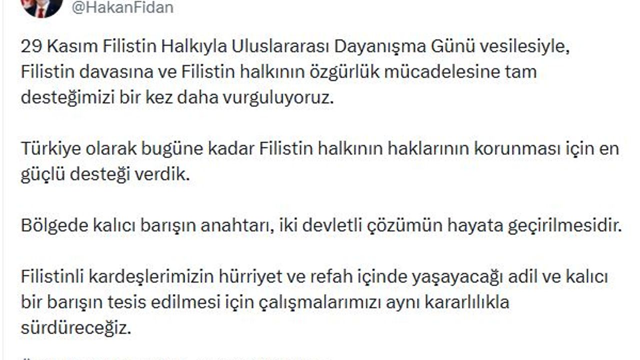 ANKARA, (DHA)- DIŞİŞLERİ Bakanı Hakan Fidan, '29 Kasım Filistin Halkıyla Uluslararası Dayanışma Günü vesilesiyle, Filistin davasına ve Filistin halkının özgürlük mücadelesine tam desteğimizi bir kez daha vurguluyoruz' dedi.