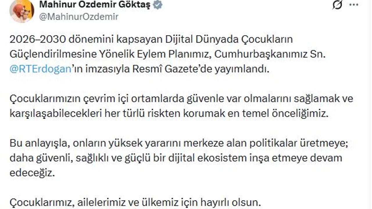 Bakan Göktaş, sanal medya hesabından yaptığı açıklamada, Resmi Gazete'de yayımlan Dijital Dünyada Çocukların Güçlendirilmesine Yönelik Eylem Planı'nın, çocuklar, aileler ve Türkiye için hayırlı olması dileğinde bulundu. Göktaş, '2026-2030 dönemini kapsayan Dijital Dünyada Çocukların Güçlendirilmesine Yönelik Eylem Planımız, Cumhurbaşkanımız Sayın Recep Tayyip Erdoğan'ın imzasıyla Resmi Gazete'de yayımlandı. Çocuklarımızın çevrim içi ortamlarda güvenle var olmalarını sağlamak ve karşılaşabilecekleri her türlü riskten korumak en temel önceliğimiz. Bu anlayışla, onların yüksek yararını merkeze alan politikalar üretmeye; daha güvenli, sağlıklı ve güçlü bir dijital ekosistem inşa etmeye devam edeceğiz. Çocuklarımız, ailelerimiz ve ülkemiz için hayırlı olsun' ifadelerini kullandı. (DHA)