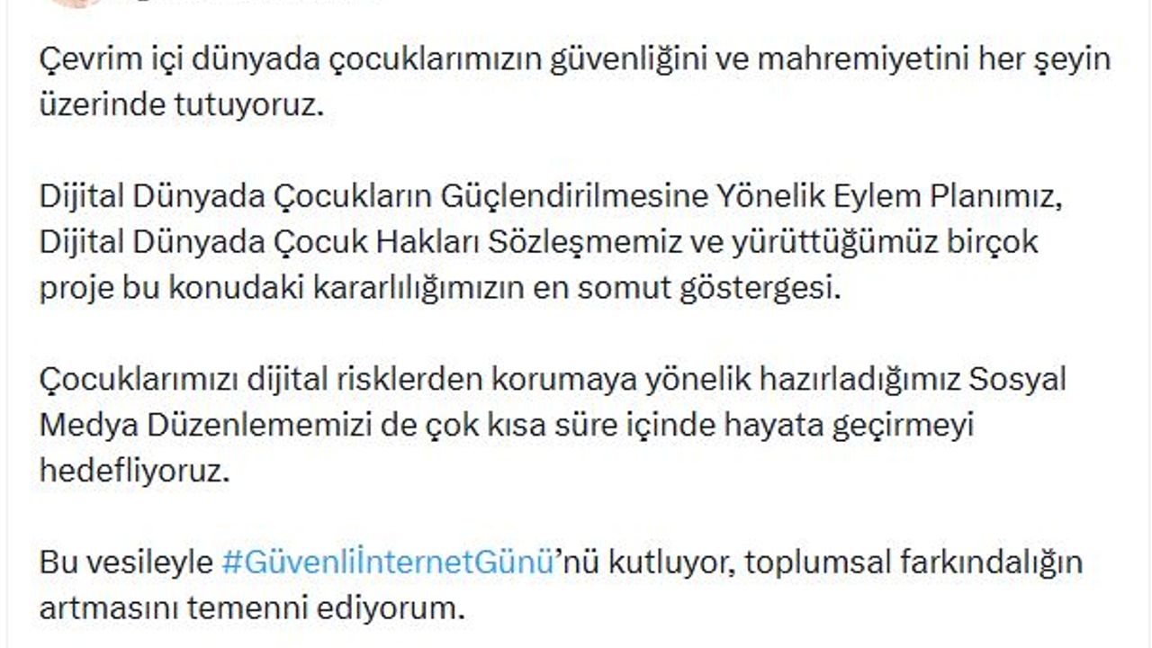 Aile ve Sosyal Hizmetler Bakanı Mahinur Özdemir Göktaş, sanal medya hesabından yaptığı açıklamada, 'Çevrim içi dünyada çocuklarımızın güvenliğini ve mahremiyetini her şeyin üzerinde tutuyoruz. Dijital Dünyada Çocukların Güçlendirilmesine Yönelik Eylem Planımız, Dijital Dünyada Çocuk Hakları Sözleşmemiz ve yürüttüğümüz birçok proje bu konudaki kararlılığımızın en somut göstergesi. Çocuklarımızı dijital risklerden korumaya yönelik hazırladığımız sosyal medya düzenlememizi de çok kısa süre içinde hayata geçirmeyi hedefliyoruz. Bu vesileyle Güvenli İnternet Günü'nü kutluyor, toplumsal farkındalığın artmasını temenni ediyorum. Hep birlikte daha iyi bir internete' dedi. (DHA)