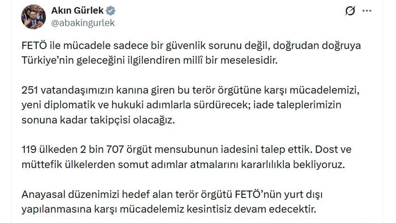 Adalet Bakanı Akın Gürlek, sanal medya hesabından yaptığı açıklamada, 'FETÖ ile mücadele sadece bir güvenlik sorunu değil, doğrudan doğruya Türkiye'nin geleceğini ilgilendiren milli bir meselesidir. 251 vatandaşımızın kanına giren bu terör örgütüne karşı mücadelemizi, yeni diplomatik ve hukuki adımlarla sürdürecek; iade taleplerimizin sonuna kadar takipçisi olacağız. 119 ülkeden 2 bin 707 örgüt mensubunun iadesini talep ettik. Dost ve müttefik ülkelerden somut adımlar atmalarını kararlılıkla bekliyoruz. Anayasal düzenimizi hedef alan terör örgütü FETÖ'nün yurt dışı yapılanmasına karşı mücadelemiz kesintisiz devam edecektir' ifadelerini kullandı. (DHA)