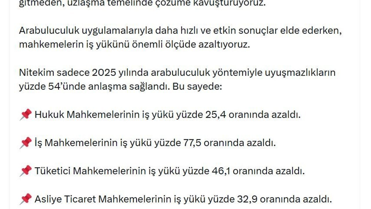 Bakan Gürlek, sanal medya hesabından yaptığı açıklamada, 'Alternatif uyuşmazlık çözüm yöntemleriyle uyuşmazlıkları yargı sürecine gitmeden, uzlaşma temelinde çözüme kavuşturuyoruz. Arabuluculuk uygulamalarıyla daha hızlı ve etkin sonuçlar elde ederken, mahkemelerin iş yükünü önemli ölçüde azaltıyoruz. Nitekim sadece 2025 yılında arabuluculuk yöntemiyle uyuşmazlıkların yüzde 54'ünde anlaşma sağlandı. Bu sayede: Hukuk Mahkemelerinin iş yükü yüzde 25,4 oranında azaldı. İş Mahkemelerinin iş yükü yüzde 77,5 oranında azaldı. Tüketici Mahkemelerinin iş yükü yüzde 46,1 oranında azaldı. Asliye Ticaret Mahkemelerinin iş yükü yüzde 32,9 oranında azaldı. Vatandaşlarımızın adalet hizmetlerinden memnuniyetini artırmak amacıyla, daha hızlı ve etkin çözümler sunan uygulamaların kapsamını genişletmeye kararlılıkla devam edeceğiz' ifadelerini kullandı. (DHA)