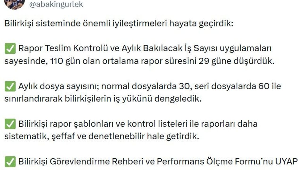ANKARA, (DHA)- ADALET Bakanı Akın Gürlek, 'Bilirkişi sisteminde önemli iyileştirmeleri hayata geçirdik. Rapor Teslim Kontrolü ve Aylık Bakılacak İş Sayısı uygulamaları sayesinde, 110 gün olan ortalama rapor süresini 29 güne düşürdük' dedi.
