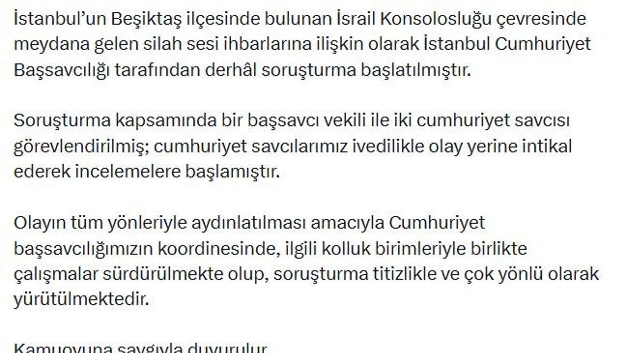 Bakan Gürlek, sanal medya hesabından yaptığı açıklamada, 'İstanbul'un Beşiktaş ilçesinde bulunan İsrail Konsolosluğu çevresinde meydana gelen silah sesi ihbarlarına ilişkin olarak İstanbul Cumhuriyet Başsavcılığı tarafından derhal soruşturma başlatılmıştır. Soruşturma kapsamında bir başsavcı vekili ile iki Cumhuriyet savcısı görevlendirilmiş; Cumhuriyet savcılarımız ivedilikle olay yerine intikal ederek incelemelere başlamıştır. Olayın tüm yönleriyle aydınlatılması amacıyla Cumhuriyet başsavcılığımızın koordinesinde, ilgili kolluk birimleriyle birlikte çalışmalar sürdürülmekte olup, soruşturma titizlikle ve çok yönlü olarak yürütülmektedir' ifadelerini kullandı. (DHA)