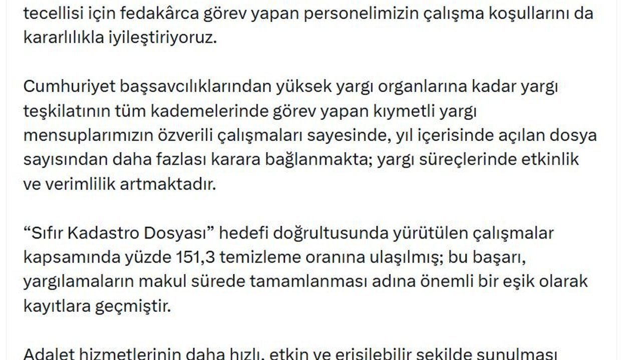 Bakan Gürlek, sanal medya hesabından yaptığı açıklamada, 'Adalet teşkilatımızın fiziki ve teknik kapasitesini güçlendirirken, adaletin tecellisi için fedakarca görev yapan personelimizin çalışma koşullarını da kararlılıkla iyileştiriyoruz. Cumhuriyet başsavcılıklarından yüksek yargı organlarına kadar yargı teşkilatının tüm kademelerinde görev yapan kıymetli yargı mensuplarımızın özverili çalışmaları sayesinde, yıl içerisinde açılan dosya sayısından daha fazlası karara bağlanmakta; yargı süreçlerinde etkinlik ve verimlilik artmaktadır. 'Sıfır Kadastro Dosyası' hedefi doğrultusunda yürütülen çalışmalar kapsamında yüzde 151,3 temizleme oranına ulaşılmış; bu başarı, yargılamaların makul sürede tamamlanması adına önemli bir eşik olarak kayıtlara geçmiştir' dedi.