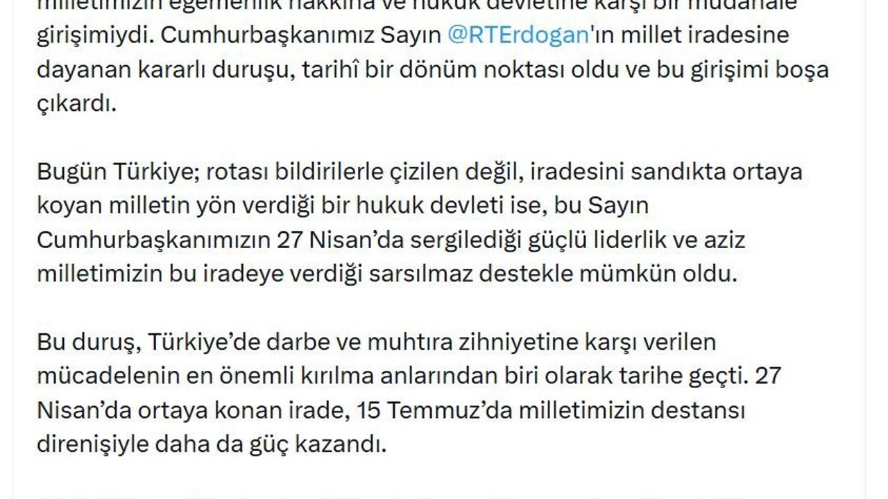 Bakan Gürlek, sanal medya hesabından yaptığı açıklamada, '27 Nisan e-muhtırası, seçilmiş hükümeti hedef alan ve doğrudan milletimizin egemenlik hakkına ve hukuk devletine karşı bir müdahale girişimiydi. Cumhurbaşkanımız Sayın Recep Tayyip Erdoğan'ın millet iradesine dayanan kararlı duruşu, tarihi bir dönüm noktası oldu ve bu girişimi boşa çıkardı. Bugün Türkiye; rotası bildirilerle çizilen değil, iradesini sandıkta ortaya koyan milletin yön verdiği bir hukuk devleti ise, bu Sayın Cumhurbaşkanımızın 27 Nisan'da sergilediği güçlü liderlik ve aziz milletimizin bu iradeye verdiği sarsılmaz destekle mümkün oldu. Bu duruş, Türkiye'de darbe ve muhtıra zihniyetine karşı verilen mücadelenin en önemli kırılma anlarından biri olarak tarihe geçti. 27 Nisan'da ortaya konan irade, 15 Temmuz'da milletimizin destansı direnişiyle daha da güç kazandı' ifadelerini kullandı.