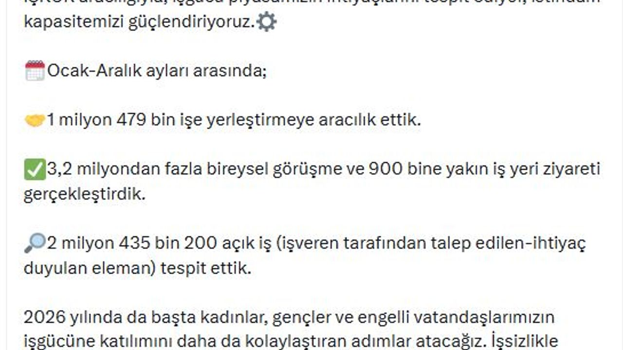 Bakan Işıkhan, sanal medya hesabından yaptığı açıklamada, 'İŞKUR aracılığıyla; iş gücü piyasamızın ihtiyaçlarını tespit ediyor, istihdam kapasitemizi güçlendiriyoruz. Ocak-aralık ayları arasında; 1 milyon 479 bin işe yerleştirmeye aracılık ettik. 3,2 milyondan fazla bireysel görüşme ve 900 bine yakın iş yeri ziyareti gerçekleştirdik. 2 milyon 435 bin 200 açık iş (işveren tarafından talep edilen-ihtiyaç duyulan eleman) tespit ettik. 2026 yılında da başta kadınlar, gençler ve engelli vatandaşlarımızın iş gücüne katılımını daha da kolaylaştıran adımlar atacağız. İşsizlikle mücadeledeki kararlılığımızı sürdüreceğiz. Unutma İŞKUR'da iş var' ifadelerini kullandı. (DHA)