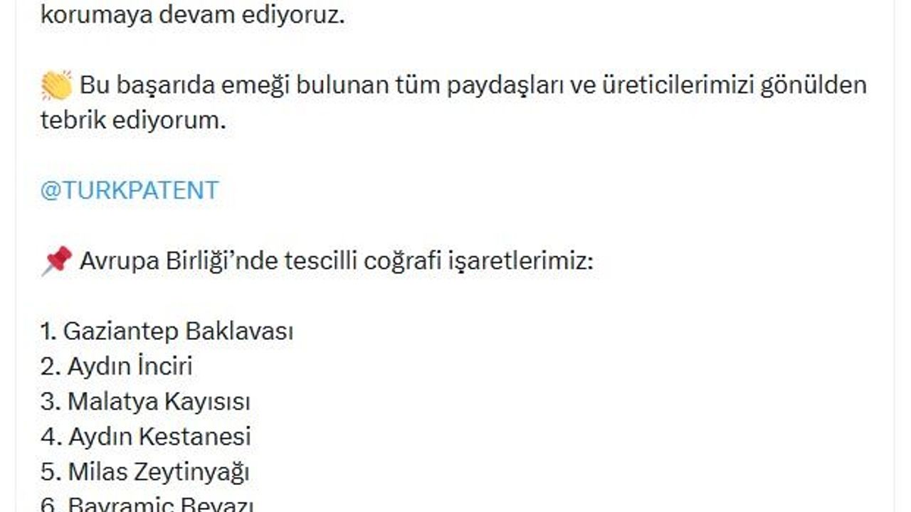 Adana şalgamının tescil edilmesiyle birlikte Türkiye'nin Avrupa Birliği'nde koruma altına alınan ürün sayısı 45'e yükseldi. Avrupa Birliği'nde tescilli coğrafi işaretli 45 Türk ürünü şöyle; 'Gaziantep Baklavası, Aydın İnciri, Malatya Kayısısı, Aydın Kestanesi, Milas Zeytinyağı, Bayramiç Beyazı, Taşköprü Sarımsağı, Giresun Tombul Fındığı, Antakya Künefesi, Suruç Narı, Çağlayancerit Cevizi, Gemlik Zeytini, Edremit Zeytinyağı, Milas Yağlı Zeytini, Ayaş Domatesi, Maraş Tarhanası, Edremit Körfezi Yeşil Çizik Zeytini, Ezine Peyniri, Safranbolu Safranı, Aydın Memecik Zeytinyağı, Araban Sarımsağı, Osmaniye Yer Fıstığı, Bingöl Balı, Bursa Şeftalisi, Hüyük Çileği, Bursa Siyah İnciri, Söke Pamuğu, Manisa Mesir Macunu, Gaziantep Menengiç Kahvesi, Silifke Yoğurdu, Aydın Memecik Zeytini, Erzincan Tulum Peyniri, Aydın Çam Fıstığı, Afyon Pastırması, Afyon Sucuğu, Antep Fıstık Ezmesi, Mut Zeytinyağı, Kırkağaç Kavunu, Hatay Kaytaz Böreği, Gaziantep Lahmacunu, İpsala Pirinci, Bursa Kestane Şekeri, Yenice Ihlamur Balı, Maraş Çöreği ve Adana Şalgamı.'(DHA)