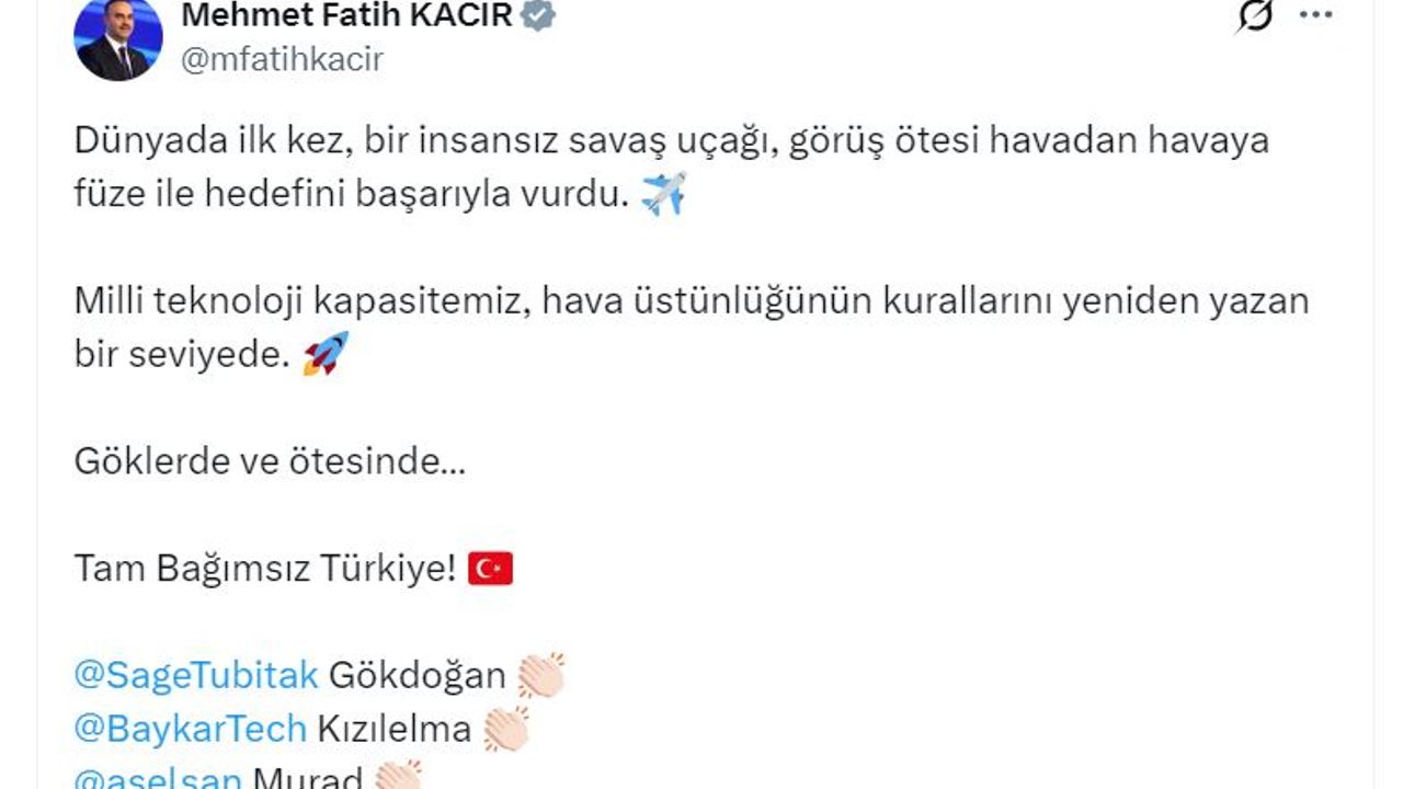 ANKARA, (DHA)- SANAYİ ve Teknoloji Bakanı Mehmet Fatih Kacır, Bayraktar KIZILELMA'nın görüş ötesi havadan havaya füzeyle hedefini başarıyla vurduğunu belirterek, 'Dünyada ilk kez, bir insansız savaş uçağı, görüş ötesi havadan havaya füze ile hedefini başarıyla vurdu. Milli teknoloji kapasitemiz, hava üstünlüğünün kurallarını yeniden yazan bir seviyede' ifadelerini kullandı.