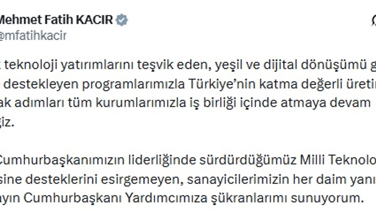 ANKARA, (DHA)- SANAYİ ve Teknoloji Bakanı Mehmet Fatih Kacır, 'Yüksek teknoloji yatırımlarını teşvik eden, yeşil ve dijital dönüşümü güçlü şekilde destekleyen programlarımızla Türkiye'nin katma değerli üretimini artıracak adımları tüm kurumlarımızla iş birliği içinde atmaya devam edeceğiz' dedi.
