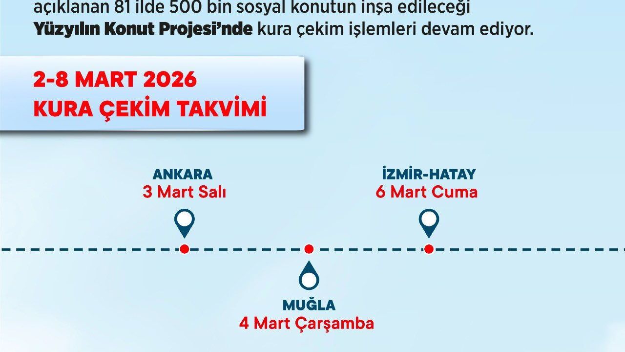 Öte yandan, Bakanlıktan yapılan açıklamaya göre; Ankara'nın kura çekim töreni 3 Mart Salı günü Cumhurbaşkanlığı Beştepe Kongre ve Kültür Merkezi'nde Cumhurbaşkanı Recep Tayyip Erdoğan ile Bakan Kurum'un katılımıyla gerçekleştirilecek. Kura töreninde Ankara'da 31 bin 73 konutun hak sahipleri belirlenecek. Bakan Kurum, 6 Mart Cuma günü de Hatay'ın kura çekim törenine katılacak.