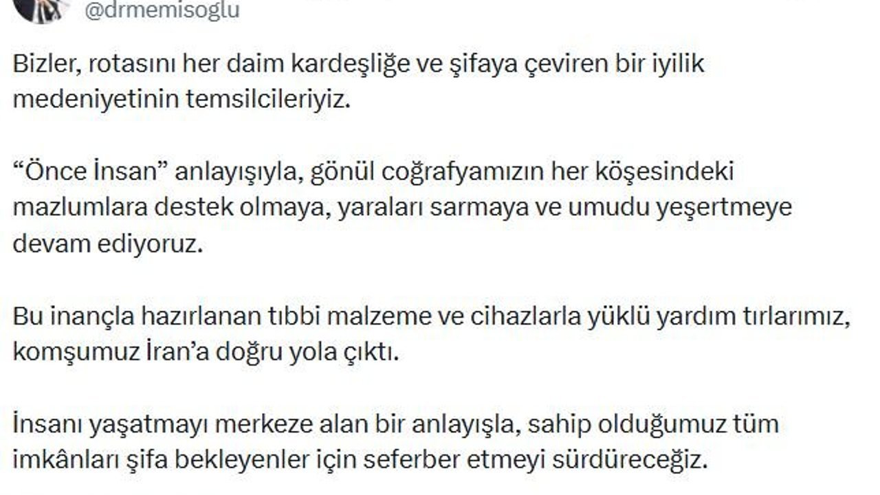 Sağlık Bakanı Kemal Memişoğlu, sanal medya hesabından yaptığı açıklamada, 'Bizler, rotasını her daim kardeşliğe ve şifaya çeviren bir iyilik medeniyetinin temsilcileriyiz. 'Önce insan' anlayışıyla, gönül coğrafyamızın her köşesindeki mazlumlara destek olmaya, yaraları sarmaya ve umudu yeşertmeye devam ediyoruz. Bu inançla hazırlanan tıbbi malzeme ve cihazlarla yüklü yardım TIR'larımız, komşumuz İran'a doğru yola çıktı. İnsanı yaşatmayı merkeze alan bir anlayışla, sahip olduğumuz tüm imkanları şifa bekleyenler için seferber etmeyi sürdüreceğiz dedi. (DHA)