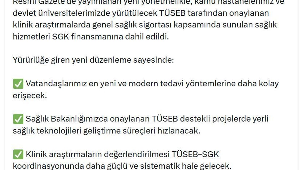 Bakan Memişoğlu, sanal medya hesabından yaptığı açıklamada, 'İcat çıkaranların ülkesi olmak için buradayız. Resmi Gazete'de yayımlanan yeni yönetmelikle, kamu hastanelerimiz ve devlet üniversitelerimizde yürütülecek TÜSEB tarafından onaylanan klinik araştırmalarda genel sağlık sigortası kapsamında sunulan sağlık hizmetleri SGK finansmanına dahil edildi. Yürürlüğe giren yeni düzenleme sayesinde: vatandaşlarımız en yeni ve modern tedavi yöntemlerine daha kolay erişecek. Sağlık Bakanlığımızca onaylanan TÜSEB destekli projelerde yerli sağlık teknolojileri geliştirme süreçleri hızlanacak. Klinik araştırmaların değerlendirilmesi TÜSEB-SGK koordinasyonunda daha güçlü ve sistematik hale gelecek. Klinik Ar-Ge faaliyetleri, hastanelerin genel hizmet bütçelerini etkilemeden sürdürülebilecek. Ülkemize ve milletimize hayırlı olsun' ifadelerini kullandı. (DHA)