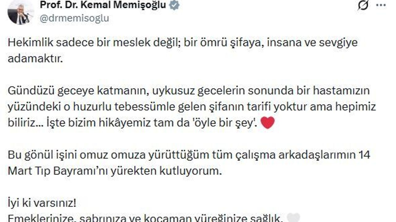 Bakan Memişoğlu, sanal medya hesabından yaptığı paylaşımda, 'Hekimlik sadece bir meslek değil; bir ömrü şifaya, insana ve sevgiye adamaktır. Gündüzü geceye katmanın, uykusuz gecelerin sonunda bir hastamızın yüzündeki o huzurlu tebessümle gelen şifanın tarifi yoktur ama hepimiz biliriz. İşte bizim hikayemiz tam da öyle bir şey. Bu gönül işini omuz omuza yürüttüğüm tüm çalışma arkadaşlarımın 14 Mart Tıp Bayramı'nı yürekten kutluyorum. İyi ki varsınız. Emeklerinize, sabrınıza ve kocaman yüreğinize sağlık' dedi. (DHA)