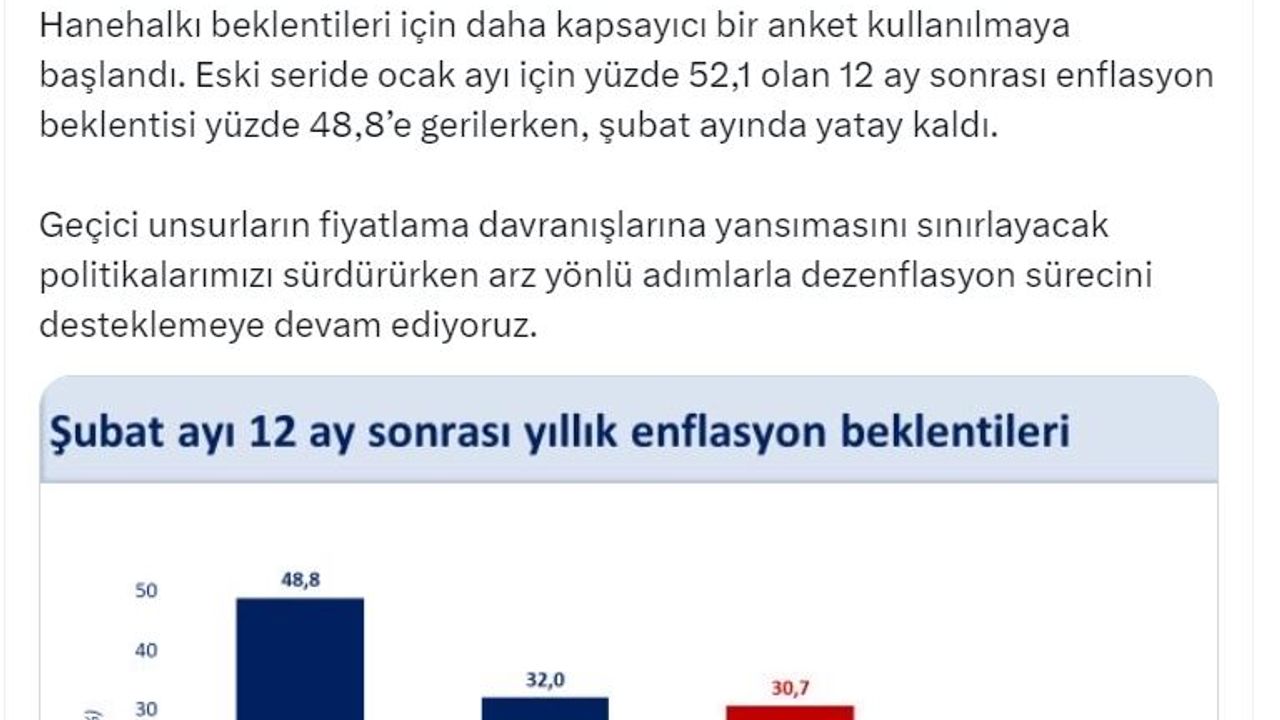 ANKARA, (DHA)- HAZİNE ve Maliye Bakanı Mehmet Şimşek, 'Piyasa tahmininin üzerinde gerçekleşen ocak ayı enflasyonuna rağmen, şubatta 12 ay sonrası enflasyon beklentileri bir önceki aya göre reel sektörde 0,9 puan, piyasa katılımcılarında 0,1 puan geriledi' dedi.