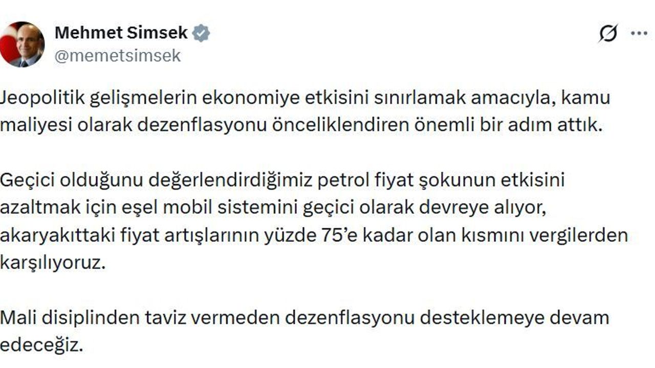 Bakan Şimşek, sanal medya hesabından yaptığı açıklamada, 'Jeopolitik gelişmelerin ekonomiye etkisini sınırlamak amacıyla, kamu maliyesi olarak dezenflasyonu önceliklendiren önemli bir adım attık. Geçici olduğunu değerlendirdiğimiz petrol fiyat şokunun etkisini azaltmak için eşel mobil sistemini geçici olarak devreye alıyor, akaryakıttaki fiyat artışlarının yüzde 75'e kadar olan kısmını vergilerden karşılıyoruz. Mali disiplinden taviz vermeden dezenflasyonu desteklemeye devam edeceğiz' ifadelerini kullandı. (DHA)