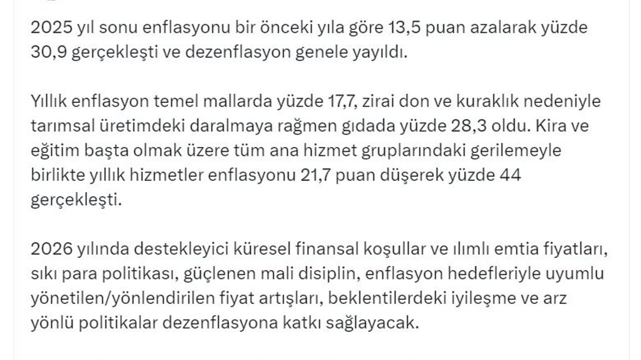 ANKARA, (DHA)- HAZİNE ve Maliye Bakanı Mehmet Şimşek, '2025 yıl sonu enflasyonu bir önceki yıla göre 13,5 puan azalarak yüzde 30,9 gerçekleşti ve dezenflasyon genele yayıldı' dedi.