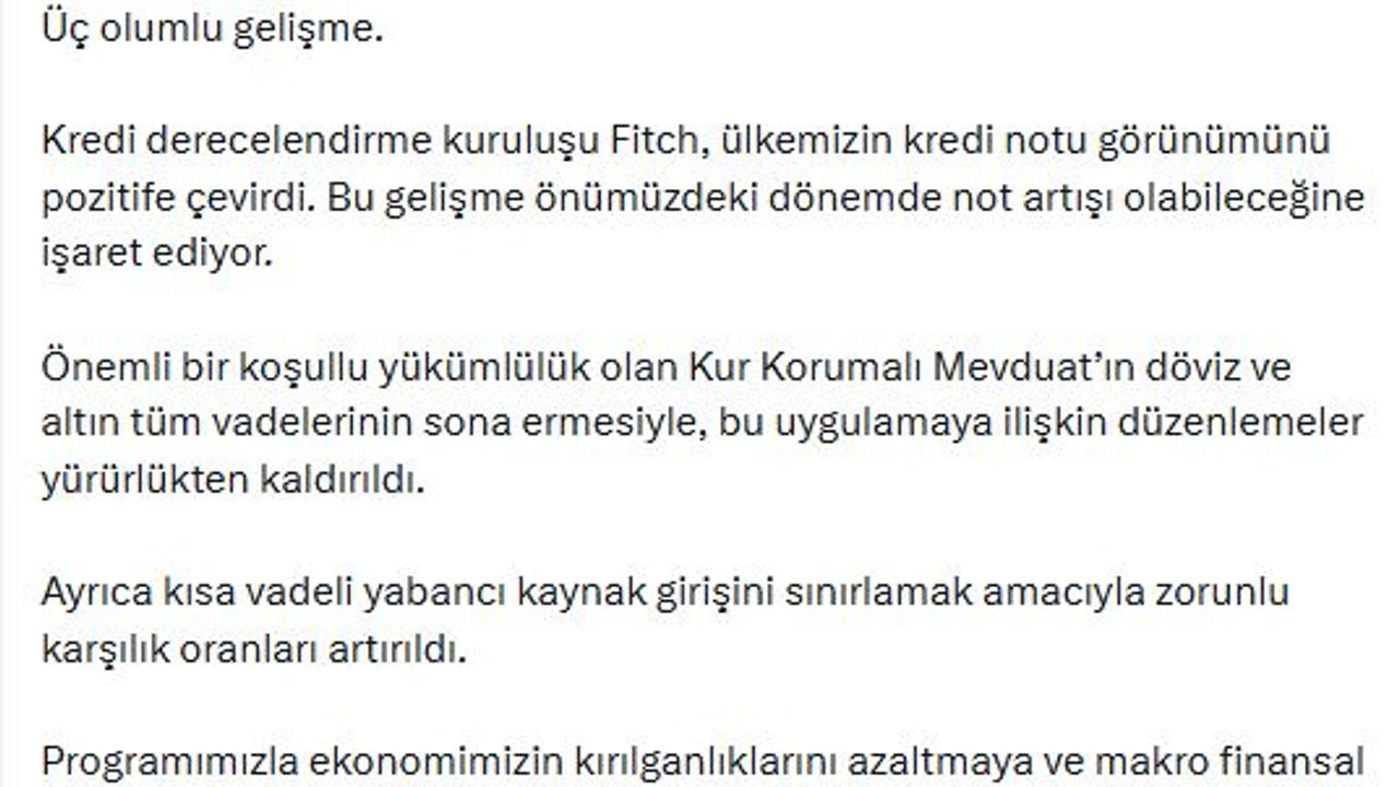 Bakan Şimşek, sanal medya hesabından yaptığı açıklamada, 'Üç olumlu gelişme; kredi derecelendirme kuruluşu Fitch, ülkemizin kredi notu görünümünü pozitife çevirdi. Bu gelişme önümüzdeki dönemde not artışı olabileceğine işaret ediyor. Önemli bir koşullu yükümlülük olan Kur Korumalı Mevduat'ın döviz ve altın tüm vadelerinin sona ermesiyle, bu uygulamaya ilişkin düzenlemeler yürürlükten kaldırıldı. Ayrıca kısa vadeli yabancı kaynak girişini sınırlamak amacıyla zorunlu karşılık oranları artırıldı. Programımızla ekonomimizin kırılganlıklarını azaltmaya ve makro finansal istikrarı güçlendirmeye devam ediyoruz' ifadelerini kullandı. (DHA)