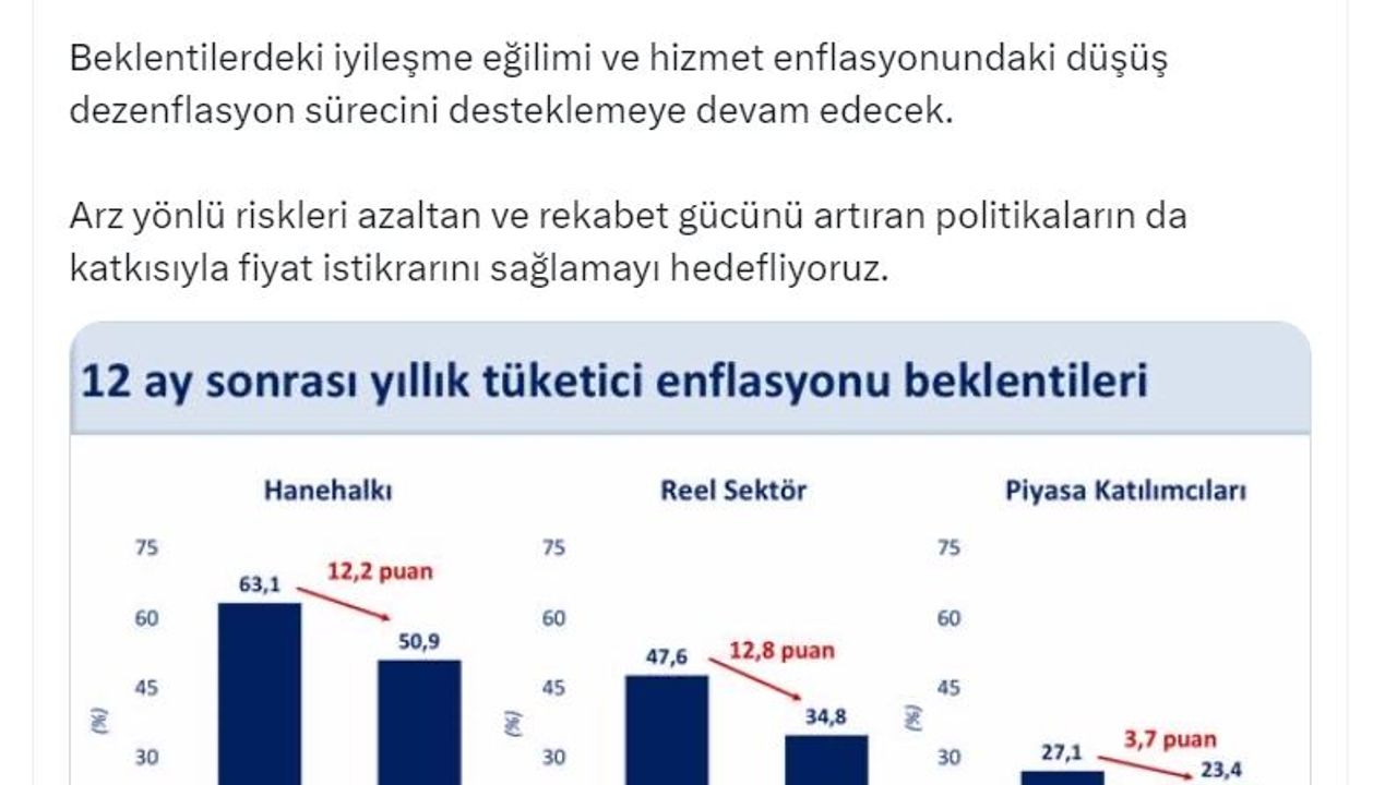 Bakan Şimşek, Türkiye Cumhuriyet Merkez Bankası'nın açıkladığı Aralık 2025 dönemine ilişkin sektörel enflasyon beklentileriyle ilgili değerlendirmede bulundu. Şimşek, sanal medya hesabından yaptığı açıklamada, '12 ay sonrası enflasyon beklentileri son bir yılda hane halkında 12,2 puan, reel sektörde 12,8 puan, piyasa katılımcılarında 3,7 puan geriledi. Beklentilerdeki iyileşme eğilimi ve hizmet enflasyonundaki düşüş dezenflasyon sürecini desteklemeye devam edecek. Arz yönlü riskleri azaltan ve rekabet gücünü artıran politikaların da katkısıyla fiyat istikrarını sağlamayı hedefliyoruz' ifadelerini kullandı. (DHA)