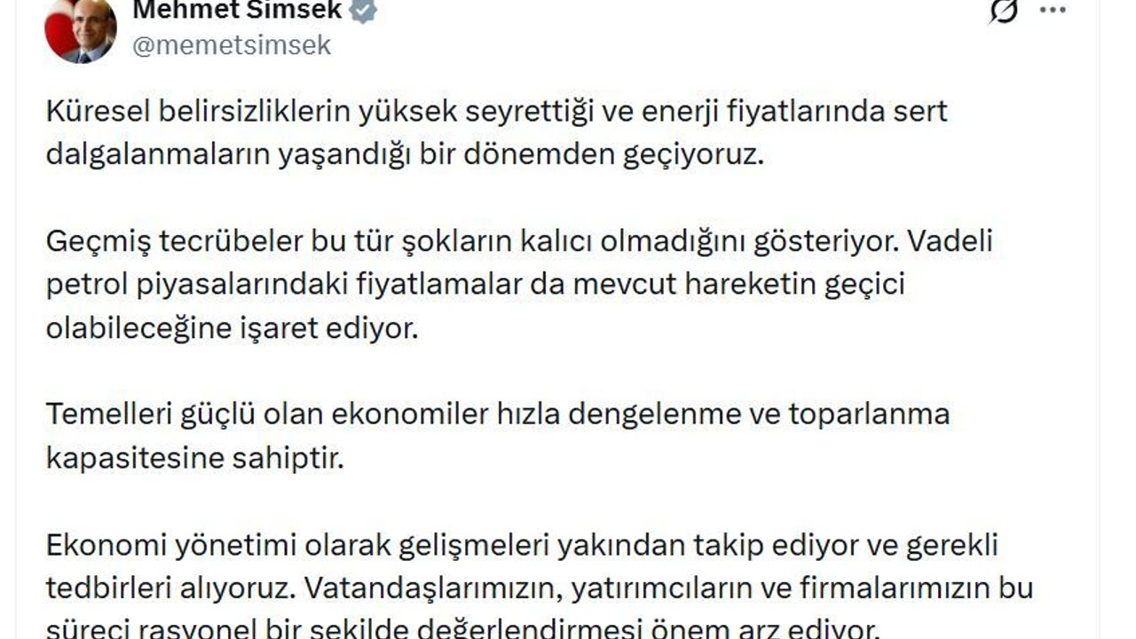 Bakan Şimşek, sanal medya hesabından yaptığı açıklamada, 'Küresel belirsizliklerin yüksek seyrettiği ve enerji fiyatlarında sert dalgalanmaların yaşandığı bir dönemden geçiyoruz. Geçmiş tecrübeler bu tür şokların kalıcı olmadığını gösteriyor. Vadeli petrol piyasalarındaki fiyatlamalar da mevcut hareketin geçici olabileceğine işaret ediyor. Temelleri güçlü olan ekonomiler hızla dengelenme ve toparlanma kapasitesine sahiptir. Ekonomi yönetimi olarak gelişmeleri yakından takip ediyor ve gerekli tedbirleri alıyoruz. Vatandaşlarımızın, yatırımcıların ve firmalarımızın bu süreci rasyonel bir şekilde değerlendirmesi önem arz ediyor' dedi. (DHA)