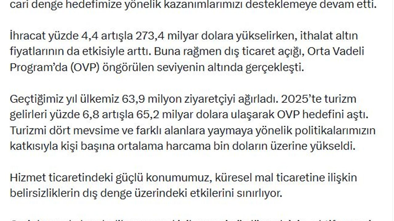 ANKARA, (DHA)- HAZİNE ve Maliye Bakanı Mehmet Şimşek, '2025 yılında ihracat ve turizmde kaydettiğimiz performans, sürdürülebilir cari denge hedefimize yönelik kazanımlarımızı desteklemeye devam etti' dedi.