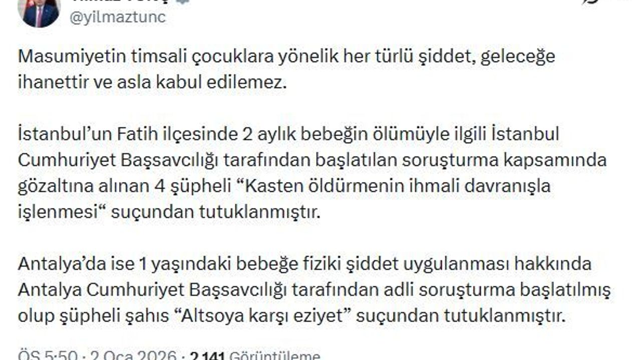 Bakan Tunç, sanal medya hesabından yaptığı açıklamada, 'Masumiyetin timsali çocuklara yönelik her türlü şiddet, geleceğe ihanettir ve asla kabul edilemez. İstanbul'un Fatih ilçesinde 2 aylık bebeğin ölümüyle ilgili İstanbul Cumhuriyet Başsavcılığı tarafından başlatılan soruşturma kapsamında gözaltına alınan 4 şüpheli, 'Kasten öldürmenin ihmali davranışla işlenmesi' suçundan tutuklanmıştır. Antalya'da ise 1 yaşındaki bebeğe fiziki şiddet uygulanması hakkında Antalya Cumhuriyet Başsavcılığı tarafından adli soruşturma başlatılmış olup şüpheli şahıs 'Altsoya karşı eziyet' suçundan tutuklanmıştır' ifadelerini kullandı. (DHA)