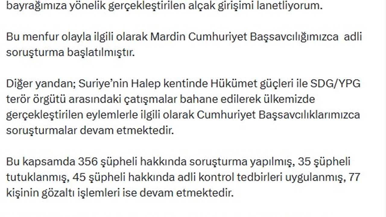 ANKARA, (DHA)- ADALET Bakanı Yılmaz Tunç, Nusaybin-Kamışlı sınır hattında terör örgütü yandaşlarınca Türk bayrağına yönelik saldırı ile ilgili Mardin Cumhuriyet Başsavcılığı tarafından soruşturma başlatıldığını açıkladı.