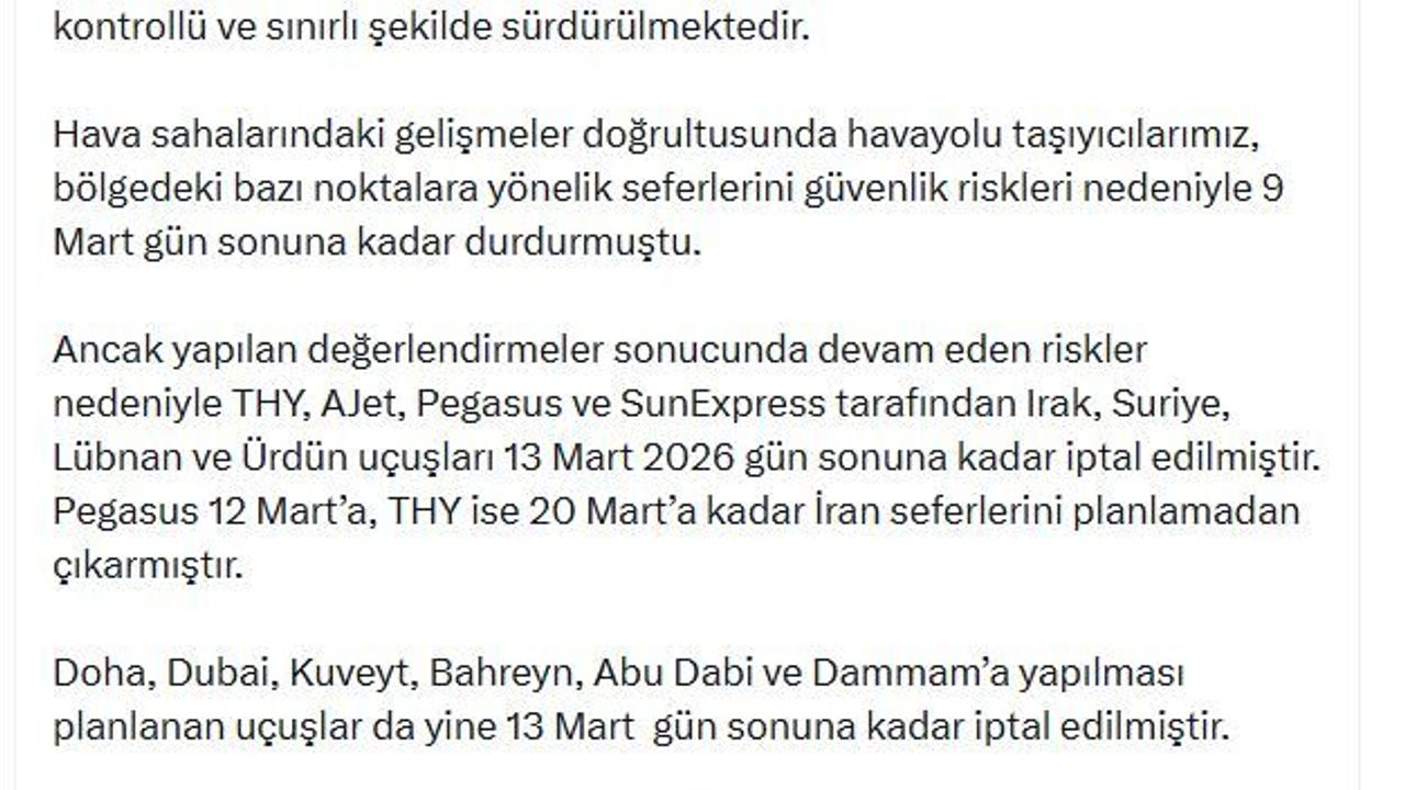 ANKARA, (DHA)- ULAŞTIRMA ve Altyapı Bakanı Abdulkadir Uraloğlu, Orta Doğu hava sahalarındaki gelişmelerin anlık olarak takip edildiğini belirterek, 'THY, AJet, Pegasus ve SunExpress tarafından Irak, Suriye, Lübnan ve Ürdün uçuşları 13 Mart 2026 gün sonuna kadar iptal edilmiştir. Pegasus 12 Mart'a, THY ise 20 Mart'a kadar İran seferlerini planlamadan çıkarmıştır' dedi.Bakan Uraloğlu sanal medya hesabından yaptığı açıklamada, Ortadoğu'da yaşanan gelişmeler ışığında hava sahalarındaki gelişmelerin yakından takip edildiğini belirterek, 'Mevcut durumda İran, İsrail, Irak, Katar, Bahreyn, Kuveyt ve Suriye'de (Halep hariç) hava sahası kapalılık NOTAM'ları devam etmektedir. Umman, Ürdün ve Suudi Arabistan'da kısmi sivil uçuşlar sürerken Birleşik Arap Emirlikleri'nde hava ulaşımı kontrollü ve sınırlı şekilde sürdürülmektedir. Hava sahalarındaki gelişmeler doğrultusunda havayolu taşıyıcılarımız, bölgedeki bazı noktalara yönelik seferlerini güvenlik riskleri nedeniyle 9 Mart gün sonuna kadar durdurmuştu. Ancak yapılan değerlendirmeler sonucunda devam eden riskler nedeniyle THY, AJet, Pegasus ve SunExpress tarafından Irak, Suriye, Lübnan ve Ürdün uçuşları 13 Mart 2026 gün sonuna kadar iptal edilmiştir. Pegasus 12 Mart'a, THY ise 20 Mart'a kadar İran seferlerini planlamadan çıkarmıştır. Doha, Dubai, Kuveyt, Bahreyn, Abu Dabi ve Dammam'a yapılması planlanan uçuşlar da yine 13 Mart gün sonuna kadar iptal edilmiştir. Türk Hava Yolları'na ve Pegasus'a ait iki uçak Tahran İmam Humeyni Uluslararası Havalimanı'nda beklemektedir. Tailwind Havayolları'nın Irak menşeli bir şirkete kiraladığı bir uçak Irak'ta bulunmaktadır. Hava sahası ve havalimanlarındaki gelişmeler doğrultusunda ilgili birimlerimiz koordineli şekilde çalışmalarını sürdürmektedir' ifadelerini kullandı. (DHA)
