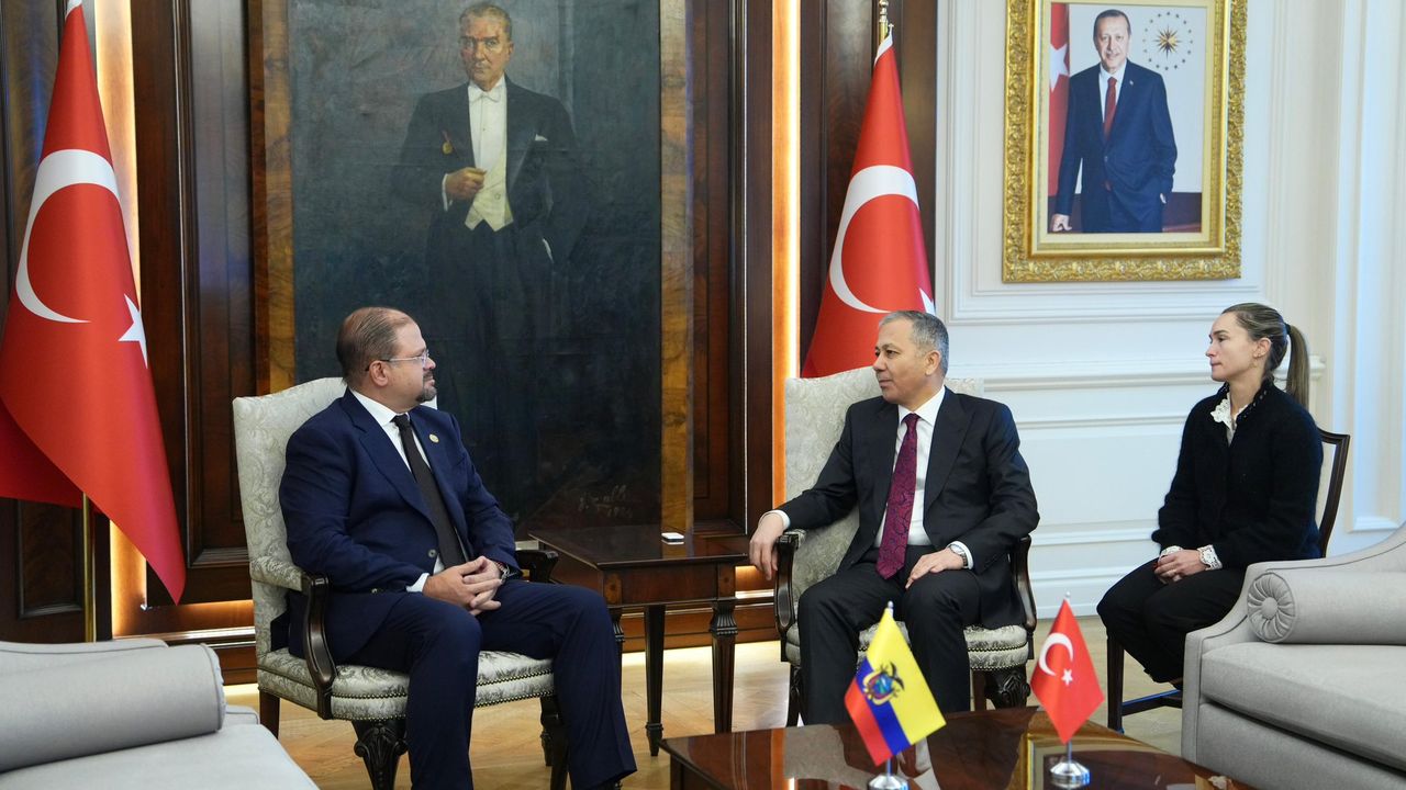 Bakan Yerlikaya, sanal medya hesabından yaptığı açıklamada, 'Ekvador Cumhuriyeti İçişleri Bakanı Sayın John Reimberg Oviedo ve heyeti ile bir araya geldik. Sayın Bakan ile başta terör, organize suç örgütleri, narkotik suçlarla mücadele ve kolluk eğitimleri olmak üzere güvenlik alanında bakanlıklarımız arasındaki iş birliği konularını değerlendirdik. 'Türkiye Cumhuriyeti Hükümeti ile Ekvador Cumhuriyeti Hükümeti Arasında Kolluk Eğitimi İşbirliği Mutabakat Zaptı' ve 'Türkiye Cumhuriyeti İçişleri Bakanlığı ile Ekvador Cumhuriyeti İçişleri Bakanlığı Arasında Güvenlik İşbirliğinin Güçlendirilmesi Hususunda Niyet Beyanı' metinlerini imzaladık. Sayın Bakana ve heyetine ziyaretleri için teşekkür ediyorum' dedi. (DHA)