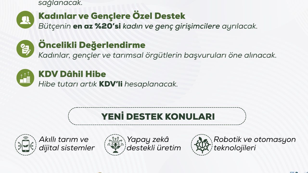 Bakan Yumaklı, sanal medya hesabı üzerinden Resmi Gazete'de yayımlanarak yürürlüğe giren kırsal kalkınma desteklerine ilişkin paylaşım yaptı. Bakan Yumaklı, 'Yeni yılda kırsal kalkınma desteklerimizde yeni dönem' başlığı ile yaptığı paylaşımda, 'Kırsal kalkınma desteklerine ilişkin karar Resmî Gazete'de yayımlandı. Yeni düzenlemeyle; hibe oranlarını yüzde 70'e kadar yükseltiyoruz. Kırsal kalkınma bütçemizin en az yüzde 20'sini kadın ve genç girişimcilerimize ayırıyoruz. Başvurularda kadınlar, gençler ve birinci derece tarımsal örgütleri önceliklendiriyoruz. Dijital tarım, yapay zekâ ve otomasyon uygulamalarını hibe kapsamına alarak kırsal dönüşüme hız kazandırıyoruz. Öncelikli değerlendirme, artırılmış hibeler ve yeni destek alanlarıyla kırsalda üretim güçleniyor, Türkiye büyüyor. Hayırlı olsun' ifadelerini kullandı. (DHA)