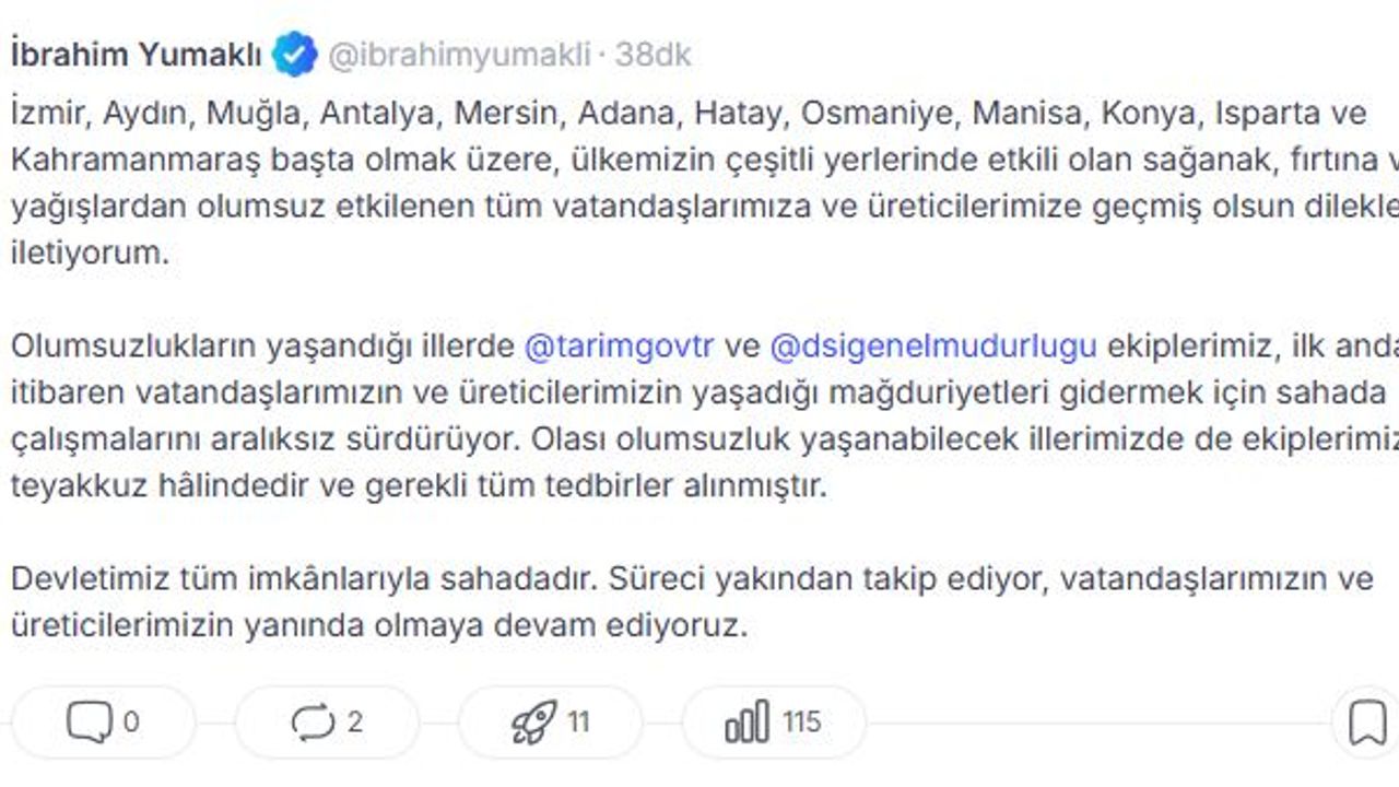 Bakan İbrahim Yumaklı, sanal medya hesabından yaptığı açıklamada, 'İzmir, Aydın, Muğla, Antalya, Mersin, Adana, Hatay, Osmaniye, Manisa, Konya, Isparta ve Kahramanmaraş başta olmak üzere, ülkemizin çeşitli yerlerinde etkili olan sağanak, fırtına ve yağışlardan olumsuz etkilenen tüm vatandaşlarımıza ve üreticilerimize geçmiş olsun dileklerimi iletiyorum. Olumsuzlukların yaşandığı illerde Tarım ve Orman Bakanlığı ve DSİ Genel Müdürlüğü ekiplerimiz, ilk andan itibaren vatandaşlarımızın ve üreticilerimizin yaşadığı mağduriyetleri gidermek için sahada çalışmalarını aralıksız sürdürüyor. Olası olumsuzluk yaşanabilecek illerimizde de ekiplerimiz teyakkuz halindedir ve gerekli tüm tedbirler alınmıştır. Devletimiz tüm imkanlarıyla sahadadır. Süreci yakından takip ediyor, vatandaşlarımızın ve üreticilerimizin yanında olmaya devam ediyoruz' ifadelerini kullandı. (DHA)