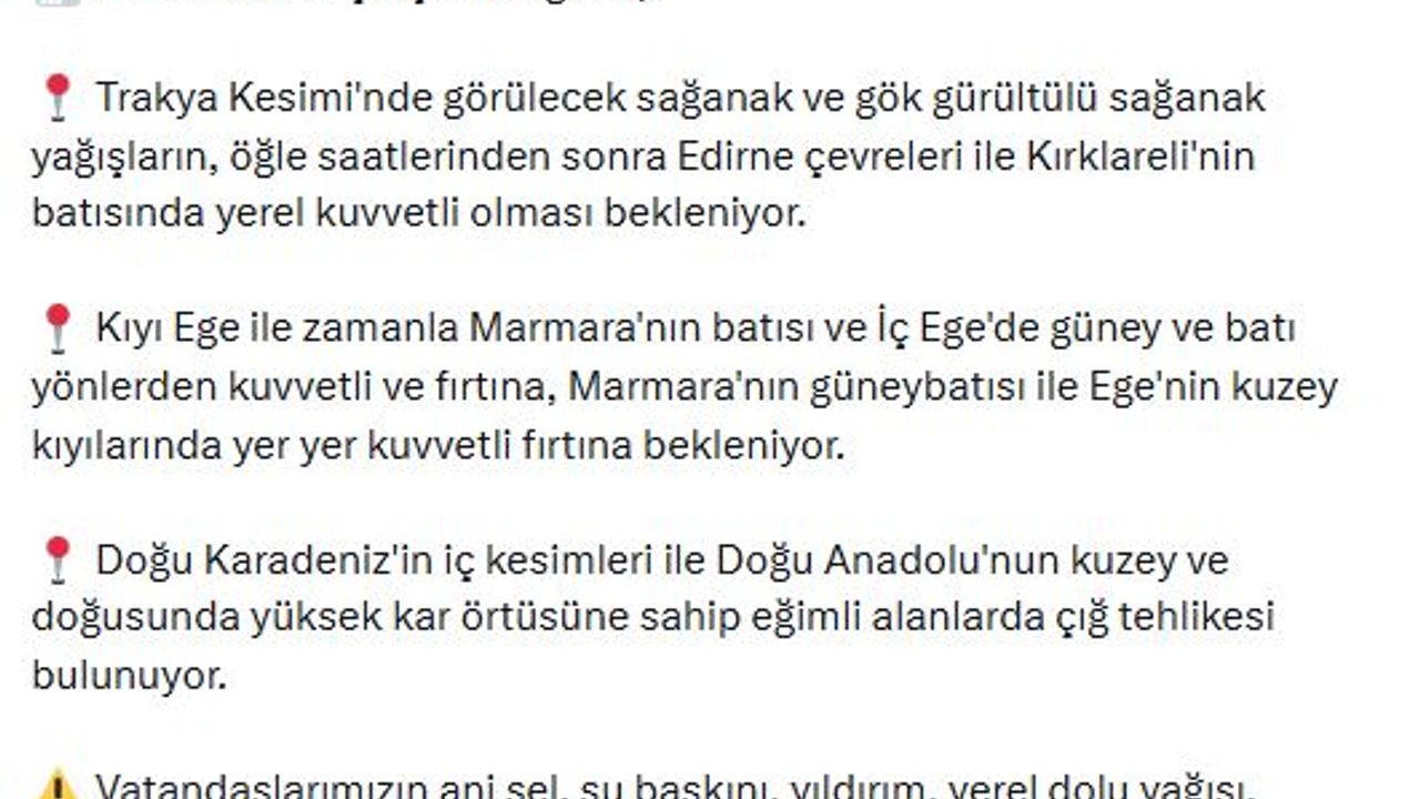 Bakanlığın sanal medya hesabından yapılan açıklamada, 'Meteoroloji Genel Müdürlüğü'nden alınan son bilgilere göre; 7 Ocak 2026 Çarşamba günü Trakya kesiminde görülecek sağanak ve gök gürültülü sağanak, öğle saatlerinden sonra Edirne çevreleri ile Kırklareli'nin batısında yerel kuvvetli olması bekleniyor. Kıyı Ege ile zamanla Marmara'nın batısı ve İç Ege'de güney ve batı yönlerden kuvvetli ve fırtına, Marmara'nın güneybatısı ile Ege'nin kuzey kıyılarında yer yer fırtına bekleniyor. Doğu Karadeniz'in iç kesimleri ile Doğu Anadolu'nun kuzey ve doğusunda yüksek kar örtüsüne sahip eğimli alanlarda çığ tehlikesi bulunuyor. Vatandaşlarımızın ani sel, su baskını, yıldırım, yerel dolu yağışı, kuvvetli rüzgar, ağaç ve direk devrilmesi, çatı uçması, soba ve doğal gaz kaynaklı baca gazı zehirlenme riski ile ulaşımda aksamalar gibi olumsuzluklara karşı dikkatli ve tedbirli olmasını; yetkili mercilerin uyarılarını dikkate almalarını önemle hatırlatıyoruz' denildi. (DHA)