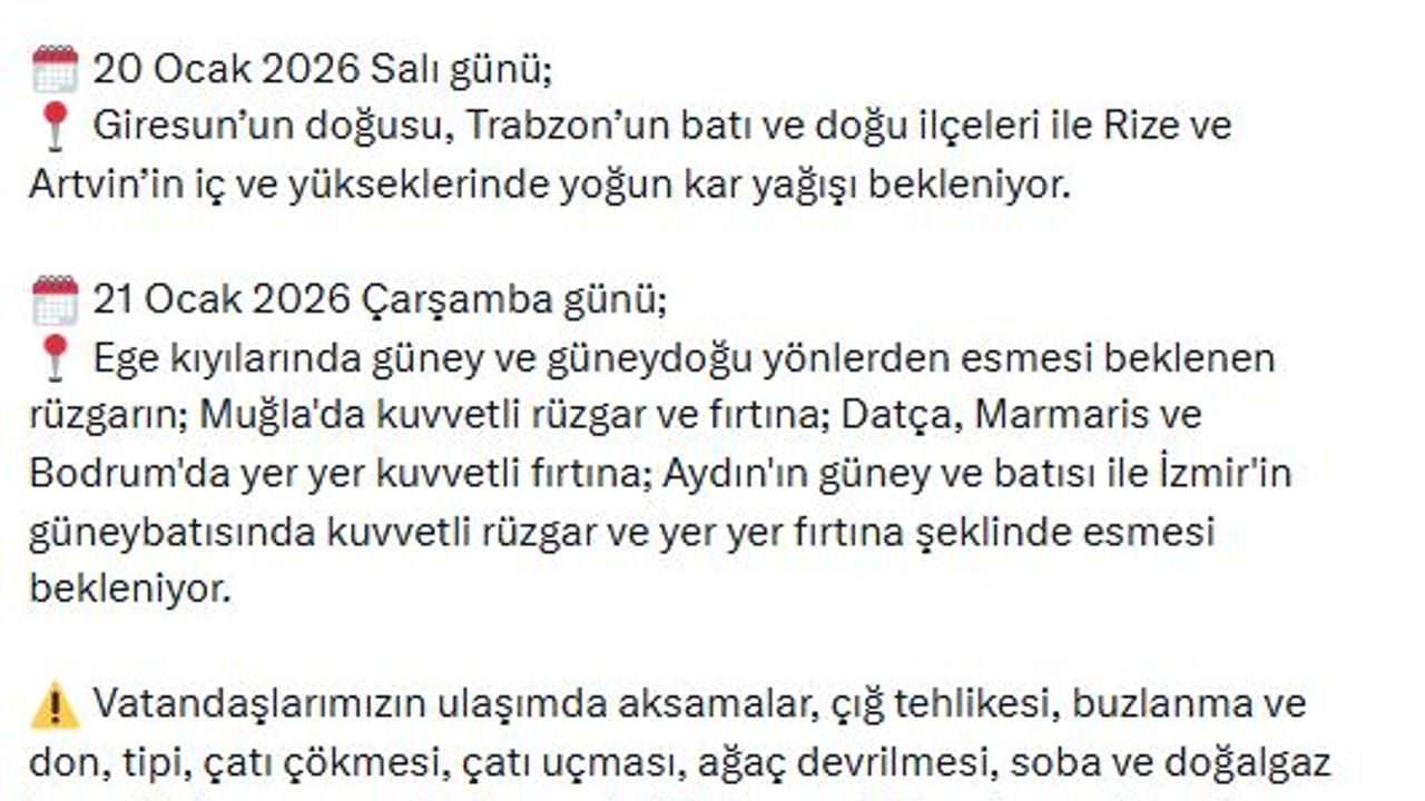 Bakanlığın sanal medya hesabından yapılan açıklamada, 'Meteoroloji Genel Müdürlüğü'nden alınan son bilgilere göre; 20 Ocak 2026 Salı günü Giresun'un doğusu, Trabzon'un batı ve doğu ilçeleri ile Rize ve Artvin'in iç ve yükseklerinde yoğun kar yağışı bekleniyor. 21 Ocak 2026 Çarşamba günü Ege kıyılarında güney ve güneydoğu yönlerden esmesi beklenen rüzgarın, Muğla'da kuvvetli rüzgar ve fırtına; Datça, Marmaris ve Bodrum'da yer yer kuvvetli fırtına, Aydın'ın güney ve batısı ile İzmir'in güneybatısında kuvvetli rüzgar ve yer yer fırtına şeklinde esmesi bekleniyor. Vatandaşlarımızın ulaşımda aksamalar, çığ tehlikesi, buzlanma ve don, tipi, çatı çökmesi, çatı uçması, ağaç devrilmesi, soba ve doğal gaz kaynaklı baca gazı zehirlenmesi gibi olumsuzluklara karşı dikkatli ve tedbirli olmasını, yetkili mercilerin uyarılarını dikkate almalarını önemle hatırlatıyoruz' denildi. (DHA)