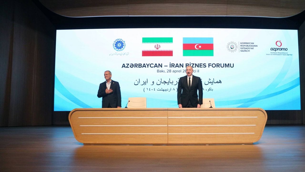 Azerbaycan Cumhurbaşkanı İlham Aliyev ile İran Cumhurbaşkanı Mesud Pezeşkiyan'ın katımıyla Bakü'de Azerbaycan-İran İş Forumu düzenlendi.Haydar Aliyev Merkezi'ndeki foruma Aliyev ile Pezeşkiyan'ın yanı sıra iki ülkeden bakanlar ve çok sayıda iş insanı katıldı.Aliyev, forumda yaptığı konuşmada Pezeşkiyan'ın bugünkü ziyareti kapsamında imzalanan belgelerin İran ile Azerbaycan arasındaki dostluk ve kardeşliği kanıtladığını, ziyaretin çok iyi siyasi sonuçlarının olduğunu söyledi.
