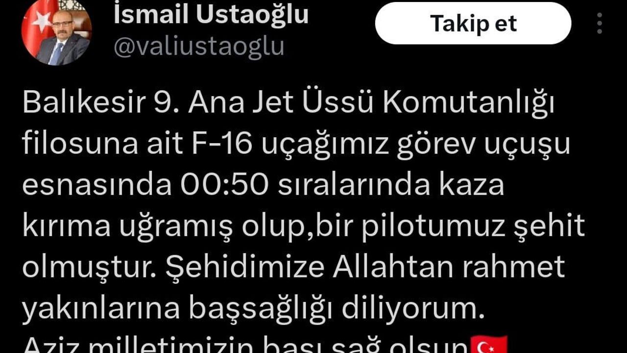 Balıkesir Valisi İsmail Ustaoğlu sanal medyadan yaptığı açıklamada, 'Balıkesir 9'uncu Ana Jet Üssü Komutanlığı filosuna ait F-6 uçağı görev uçuşu esnasında 00.50 sıralarında kaza kırıma uğramış olup, bir pilotumuz şehit olmuştur. Şehidimiz Allah'tan rahmet, yakınlarına başsağlığı diliyorum. Aziz milletimizin başı sağ olsun' dedi.