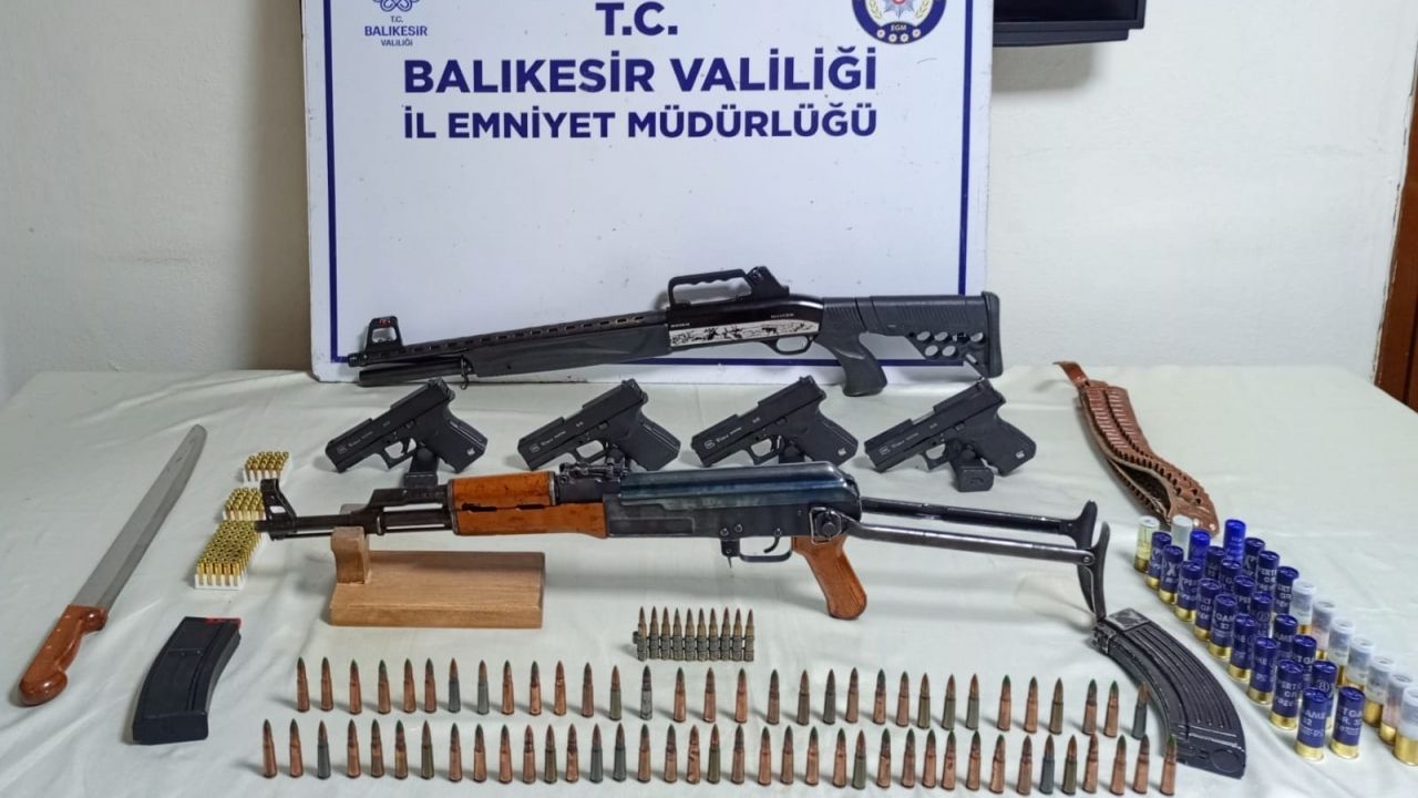 Balıkesir İl Emniyet Müdürlüğü Kaçakçılık ve Organize Suçlarla Mücadele Şubesi ile Bandırma İlçe Emniyet Müdürlüğü Kaçakçılık ve Organize Suçlarla Mücadele Şubesi ekipleri tarafından düzenlenen operasyonda 1 uzun namlulu tüfek, 1 pompalı tüfek, 4 tabanca, 1 kesici alet ile fişek ele geçirildi.