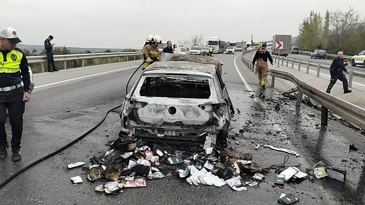 Evren ŞAKI/ KIRKAĞAÇ(Manisa), (DHA)- MANİSA'nın Kırkağaç ilçesinde bariyerlere çarptıktan sonra alev alan otomobil saniyeler içerisinde demir yığını haline dönüşürken, araçtan zamanında çıkan sürücü kazayı hafif sıyrıklarla atlattı.
