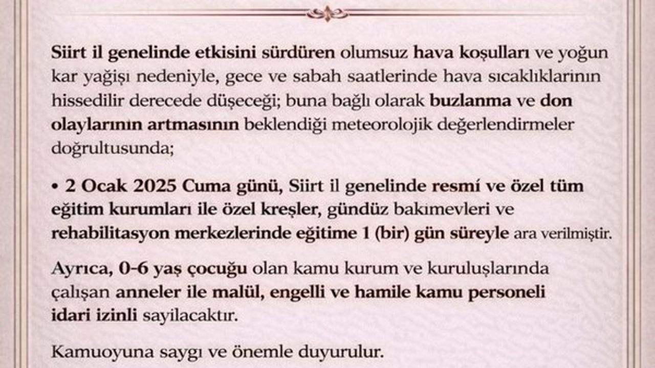 Siirt Valiliği'nden yapılan açıklamada ise 0-6 yaş çocuğu olan kamu kurum ve kuruluşlarında çalışan annelerin de idari izinli sayılacağı belirtilerek, 'Siirt il genelinde etkisini sürdüren olumsuz hava koşulları ve yoğun kar yağışı nedeniyle, gece ve sabah saatlerinde hava sıcaklıklarının hissedilir derecede düşeceği; buna bağlı olarak buzlanma ve don olaylarının artmasının beklendiği meteorolojik değerlendirmeler doğrultusunda; 2 Ocak 2025 Cuma günü, Siirt il genelinde resmi ve özel tüm eğitim kurumları ile özel kreşler, gündüz bakımevleri ve rehabilitasyon merkezlerinde eğitime 1 (bir) gün süreyle ara verilmiştir. Ayrıca, 0-6 yaş çocuğu olan kamu kurum ve kuruluşlarında çalışan anneler ile malul, engelli ve hamile kamu personeli idari izinli sayılacaktır' ifadelerine yer verildi. (DHA)