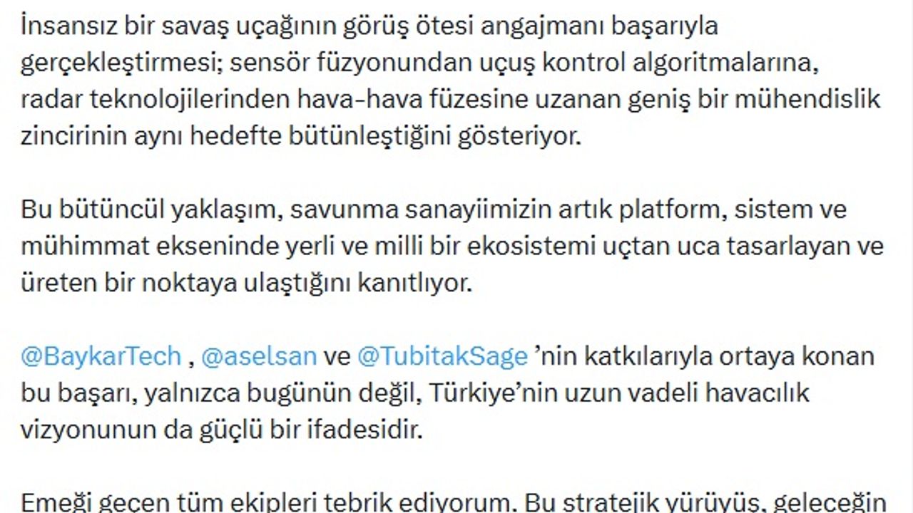 Savunma Sanayii Başkanı Haluk Görgün de sosyal medya hesabından yaptığı açıklamada, 'Gökyüzünde yeni bir çağ. İnsansız bir savaş uçağının görüş ötesi angajmanı başarıyla gerçekleştirmesi; sensör füzyonundan uçuş kontrol algoritmalarına, radar teknolojilerinden hava-hava füzesine uzanan geniş bir mühendislik zincirinin aynı hedefte bütünleştiğini gösteriyor. Bu bütüncül yaklaşım, savunma sanayiimizin artık platform, sistem ve mühimmat ekseninde yerli ve milli bir ekosistemi uçtan uca tasarlayan ve üreten bir noktaya ulaştığını kanıtlıyor. Baykar, ASELSAN ve TÜBİTAK Savunma Sanayii Araştırma ve Geliştirme Enstitüsü'nün katkılarıyla ortaya konan bu başarı, yalnızca bugünün değil, Türkiye'nin uzun vadeli havacılık vizyonunun da güçlü bir ifadesidir. Emeği geçen tüm ekipleri tebrik ediyorum. Bu stratejik yürüyüş, geleceğin teknolojilerini kendi aklıyla üreten bir Türkiye'yi inşa ediyor' dedi.