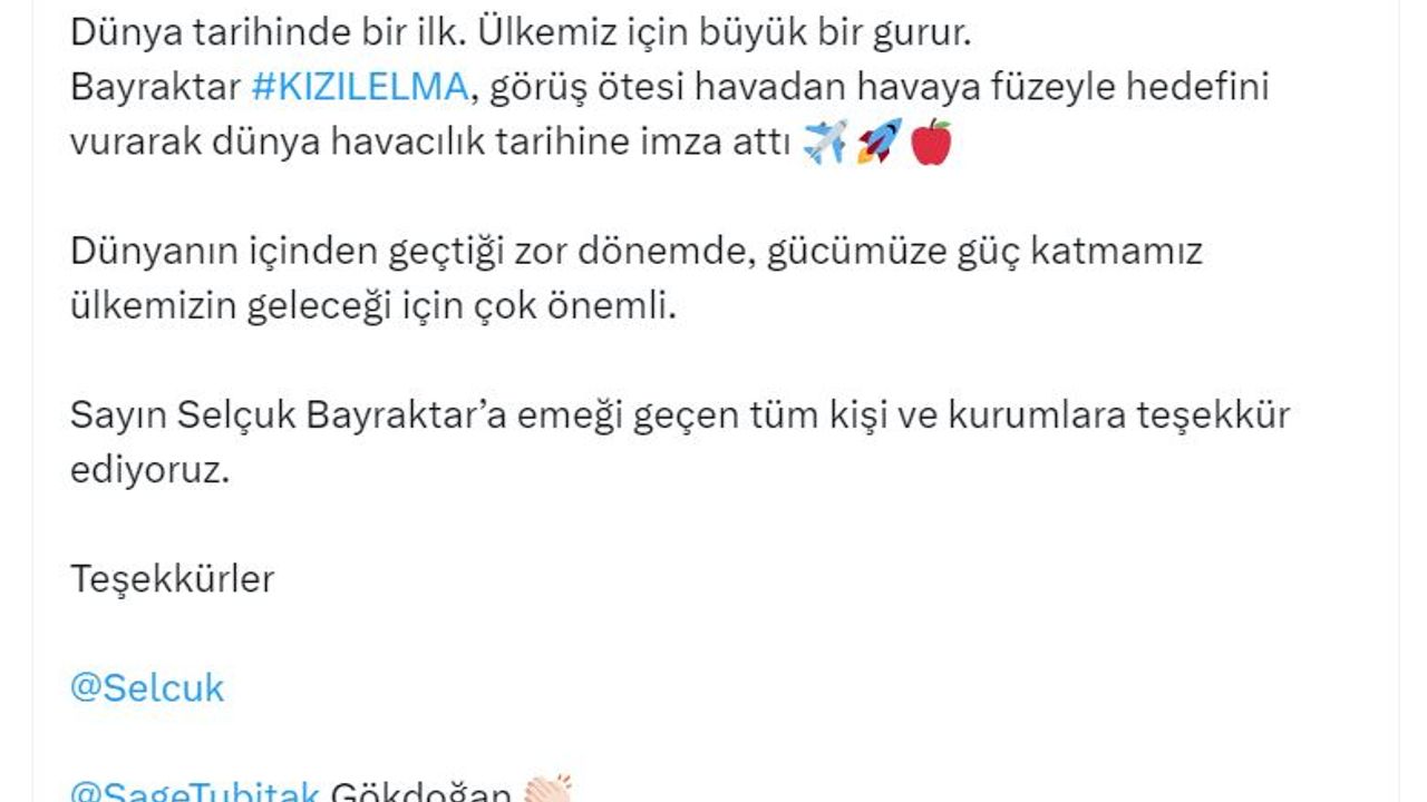 İletişim Başkanı Burhanettin Duran ise 'Bugün Türk savunma sanayii KIZILELMA ile dünya savaş teknolojisini değiştiren önemli ve gurur verici bir hamlede daha bulundu. İlk defa insansız bir hava aracı, havadan havaya füze ile hedefini tam isabetle vurdu. Etkisini gelecekte daha net bir şekilde göreceğimiz bu gelişme hava muharebelerinde oyunun kurallarını değiştirecek. Milli Teknoloji Hamlesi'nin ana taşıyıcısı olan başta Selçuk Bayraktar, Baykar, ASELSAN ve TÜBİTAK SAGE olmak üzere emeği geçen herkesi canı gönülden tebrik ediyorum' dedi.