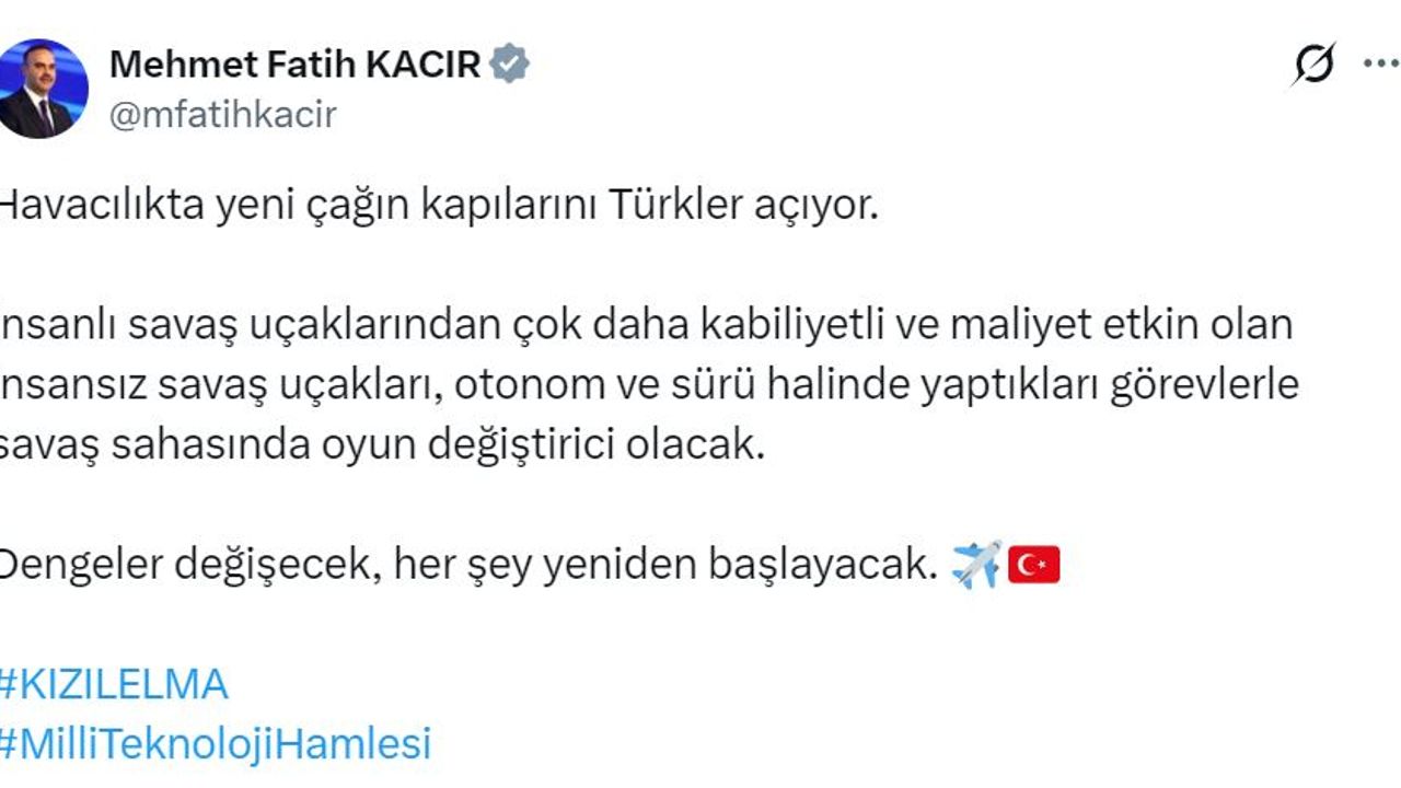 Sanayi ve Teknoloji Bakanı Mehmet Fatih Kacır, konuyla ilgili sanal medya hesabından açıklama yaptı. Kacır, 'Havacılıkta yeni çağın kapılarını Türkler açıyor. İnsanlı savaş uçaklarından çok daha kabiliyetli ve maliyet etkin olan insansız savaş uçakları, otonom ve sürü halinde yaptıkları görevlerle savaş sahasında oyun değiştirici olacak. Dengeler değişecek, her şey yeniden başlayacak' dedi. (DHA)