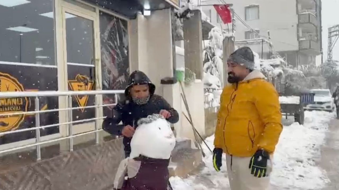 Kentte 2 gündür etkili olan kar yağışı nedeniyle ilçeye bağlı Yeni Mahalle'de kuaför salonu işleten Abdullah Kahraman, müşteri gelmeyince çırakları Yusuf Yılmaz (16) ve Ömer Duran (15) ile birlikte iş yerinin önüne kardan adam yaptı. Kardan adamın başına peruk da takan Kahraman, tarak ve makas alıp, tıraş etti.