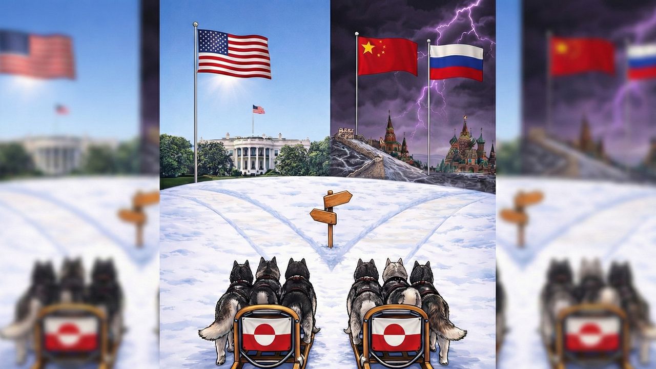 Paylaşılan görselde, üzerinde Grönland bayrağı bulunan köpek kızaklarının karlı bir arazide yol ayrımına geldiği tasvir edildi. Görselde Grönland'ın seçebileceği sol taraftaki yol; güneşli ve açık bir gökyüzü altında, Beyaz Saray'a ve dalgalanan ABD bayrağına çıkarken; sağ taraftaki yol ise fırtınalı ve karanlık bir gökyüzü altında, Çin ve Rusya bayrakları ile bu ülkelerin simgelerine (Çin Seddi ve Aziz Vasil Katedrali) doğru uzanıyor.