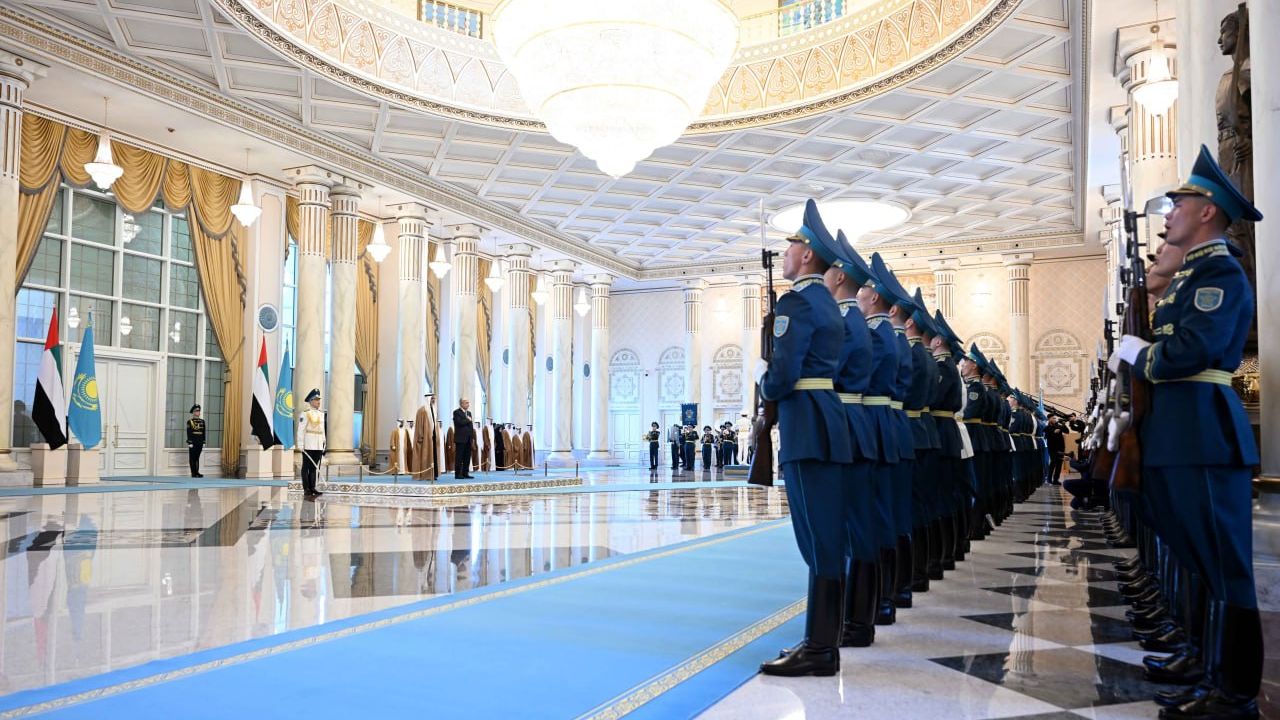 Resmi ziyaret kapsamında başkent Astana’ya gelen BAE Abu Dabi Veliaht Prensi Al Nahyan, Cumhurbaşkanlığı Sarayı Akorda’da Kazakistan Cumhurbaşkanı Kasım Cömert Tokayev tarafından törenle karşılandı.