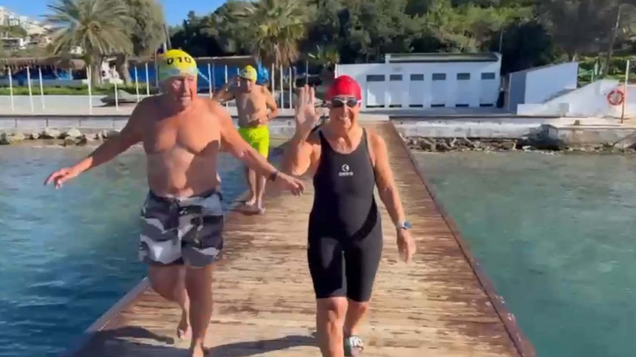 Öte yandan, Milas'ın Adabükü Mahallesi'nde yaşayan yüzücüler Sami Gemicioğlu (89), Sevil Gemicioğlu (78) ve oğulları milli yüzücü, kaptan Bekir Emrah Gemicioğlu (56) da yeni yılın ilk gününde denize girdi. (DHA)