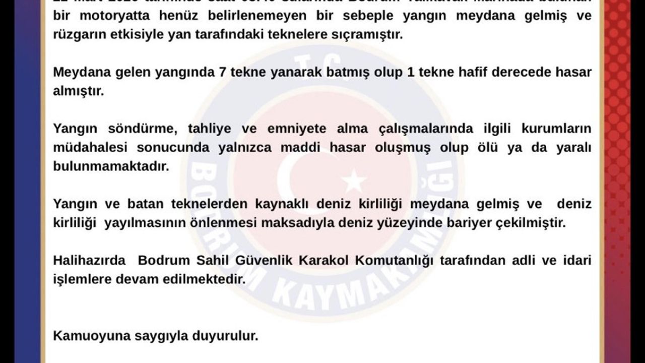 Bu arada Bodrum Kaymakamlığı'ndan yangına ilişkin açıklama yapıldı. Açıklamada şöyle denildi: